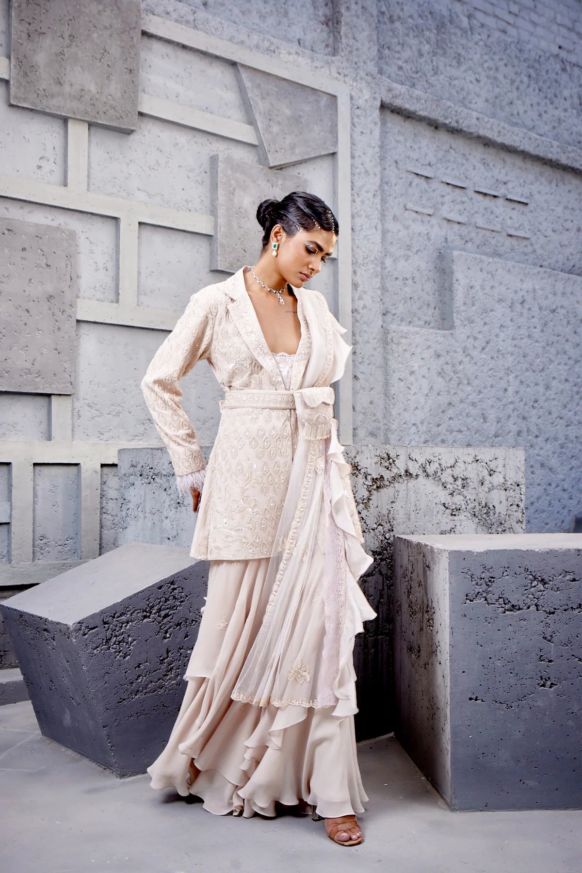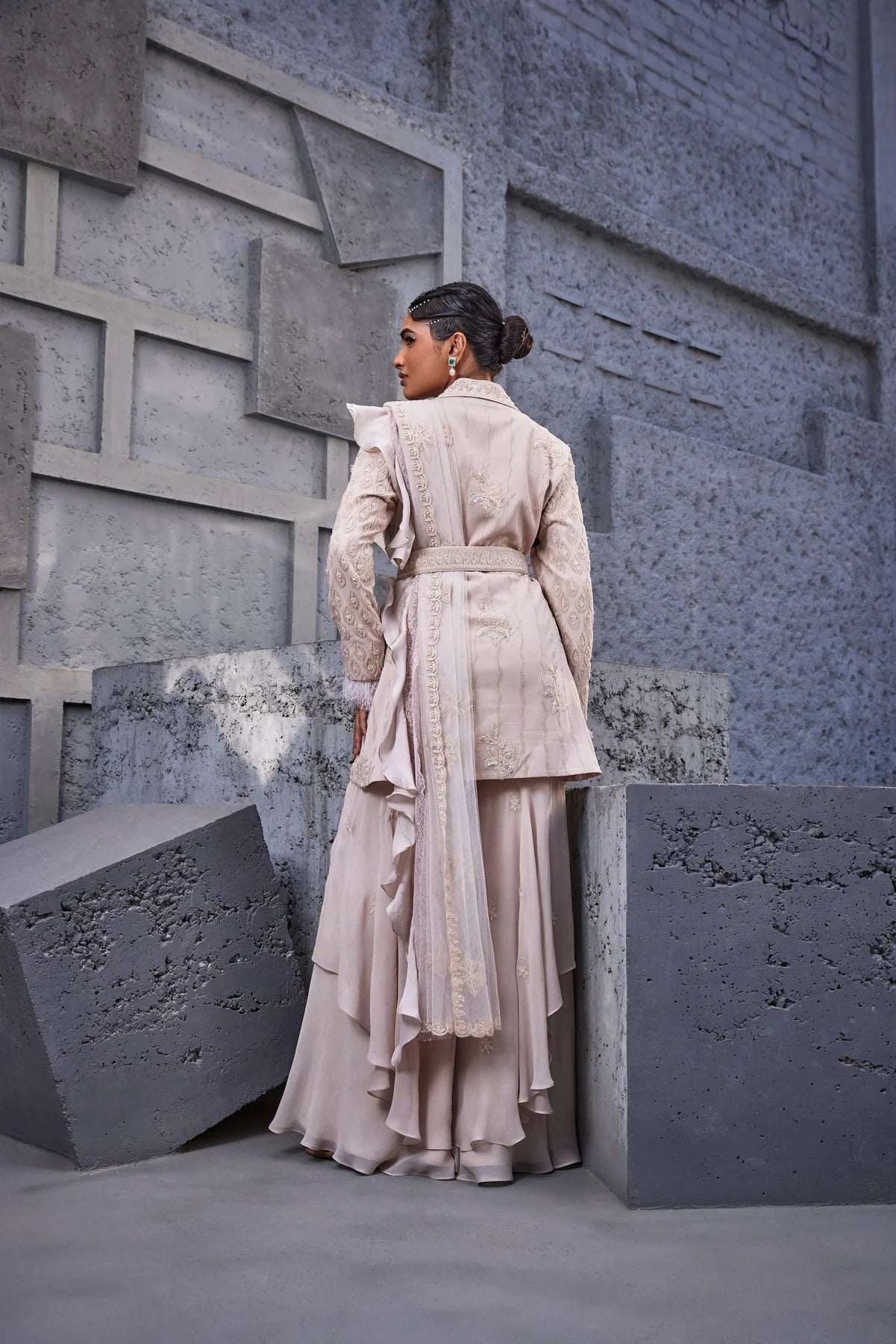 (Jacket: 31 inches, Sharara: 45 inches, Dupatta: 98 inches, Belt and Bag)