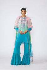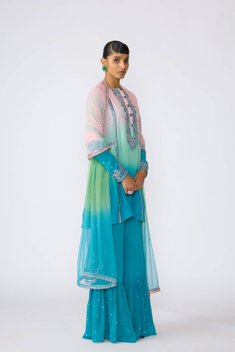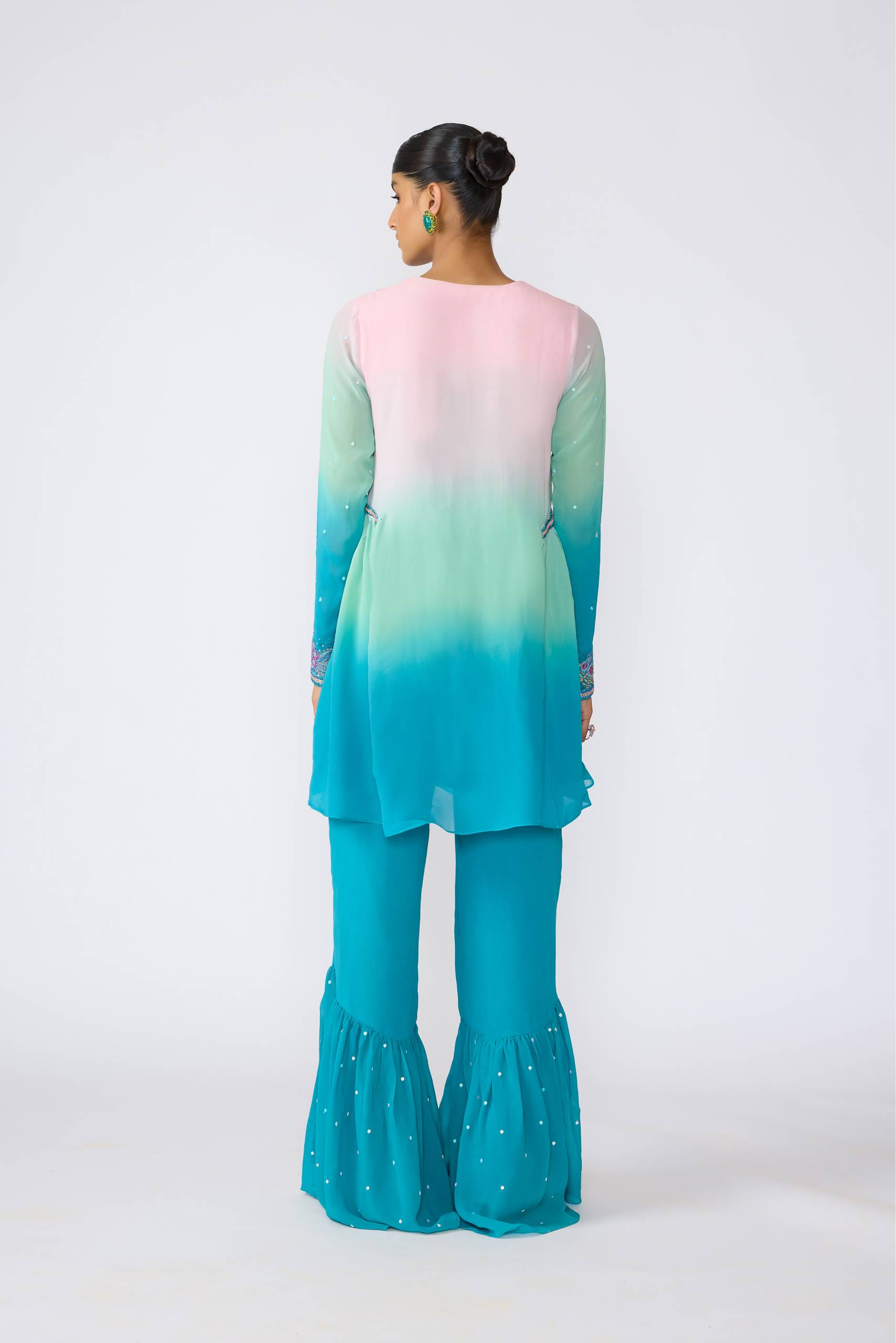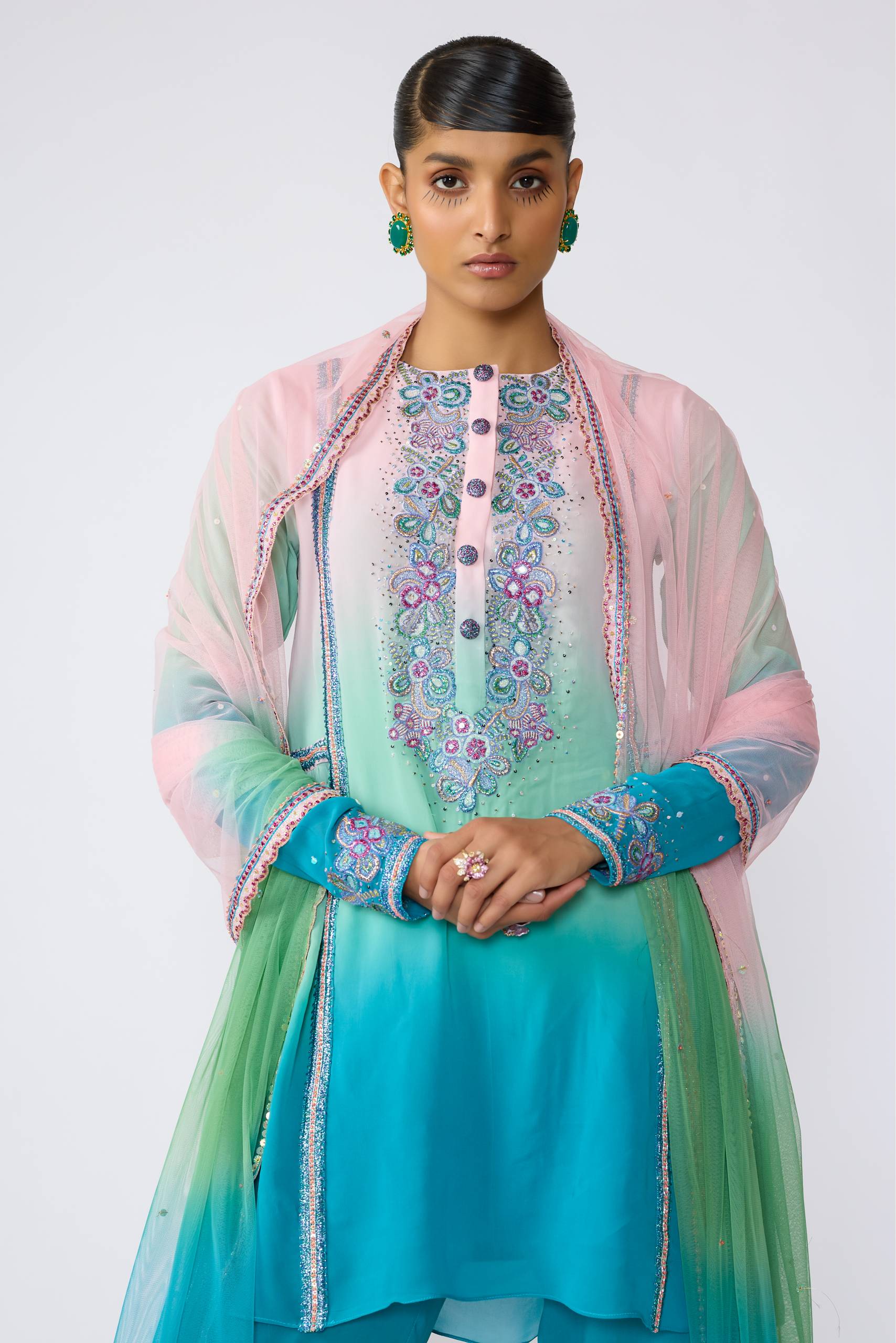Kinfolk aurora ombre embellished viscose georgette short kurta with pants & tulle dupatta