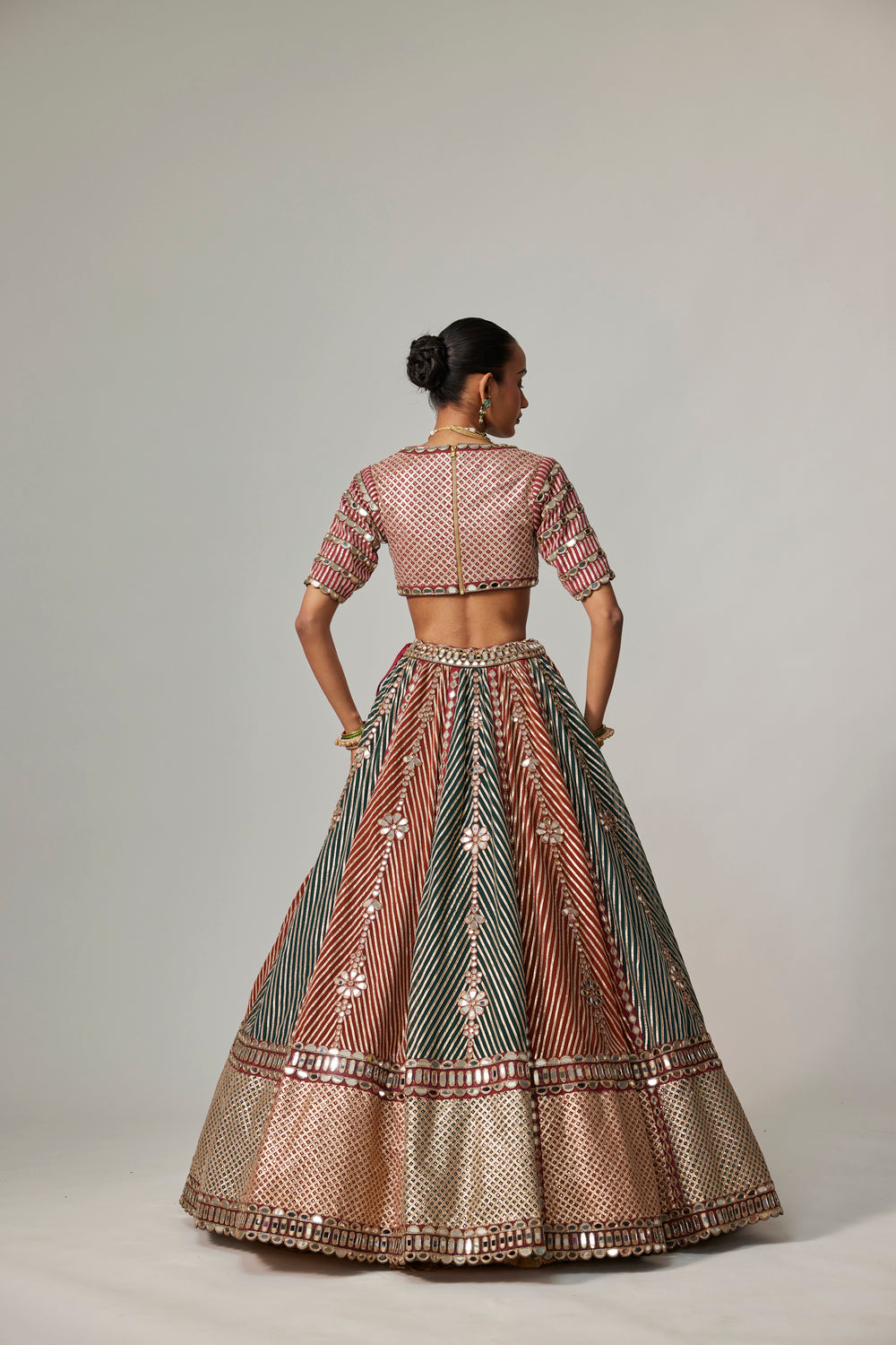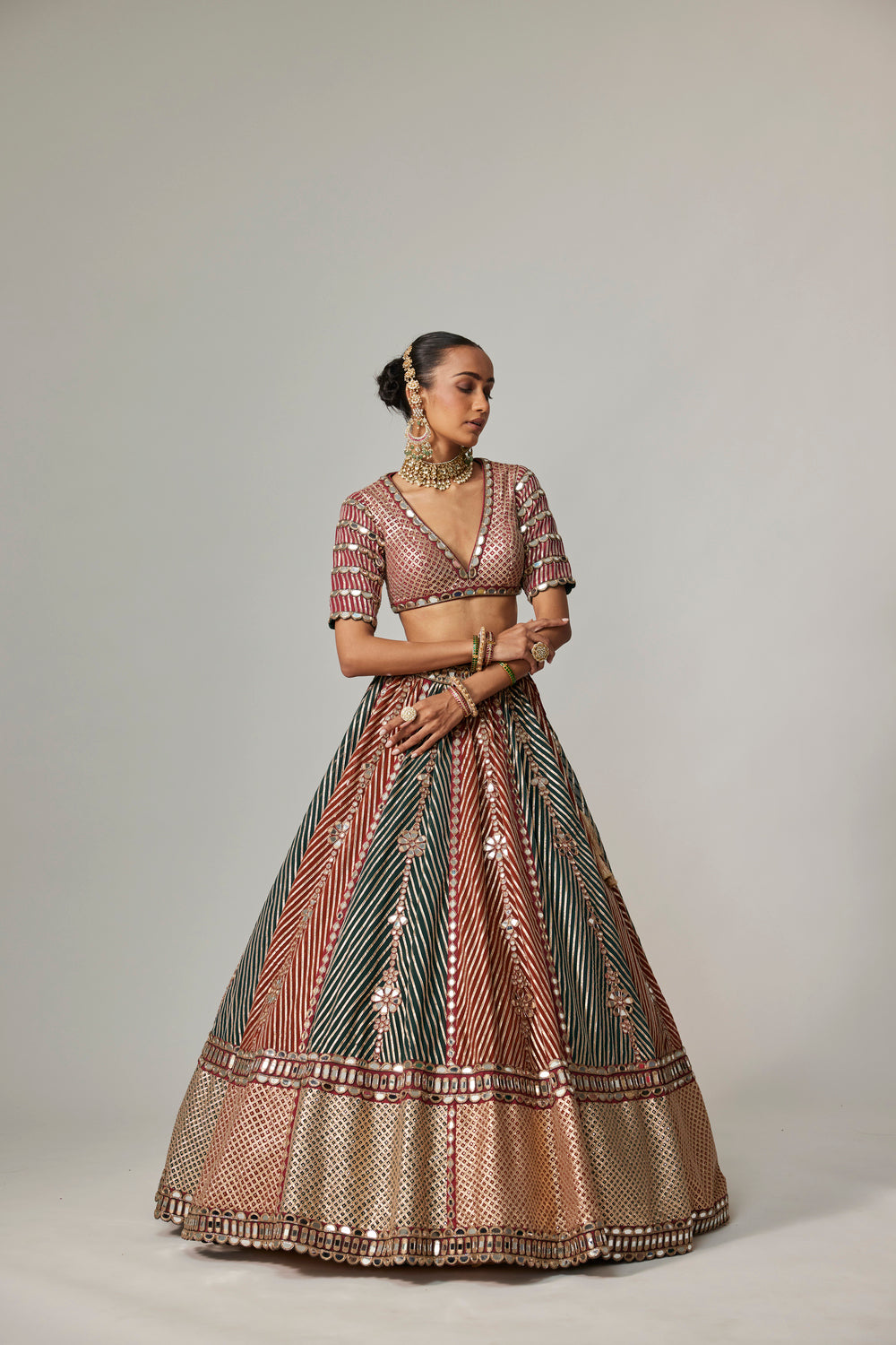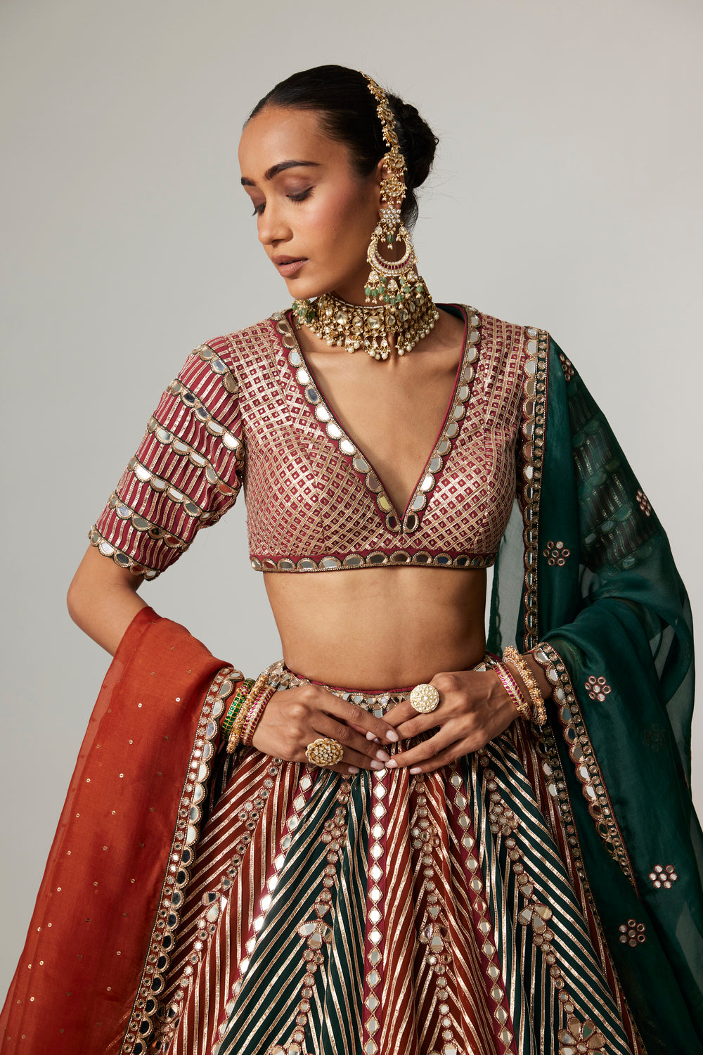 A vibrant multicolor lehenga in jade green, rust, and cranberry tones, adorned with golden gota embroidery. It is paired with a V-neck georgette blouse and two organza dupattas—one in jade green and the other in rust.