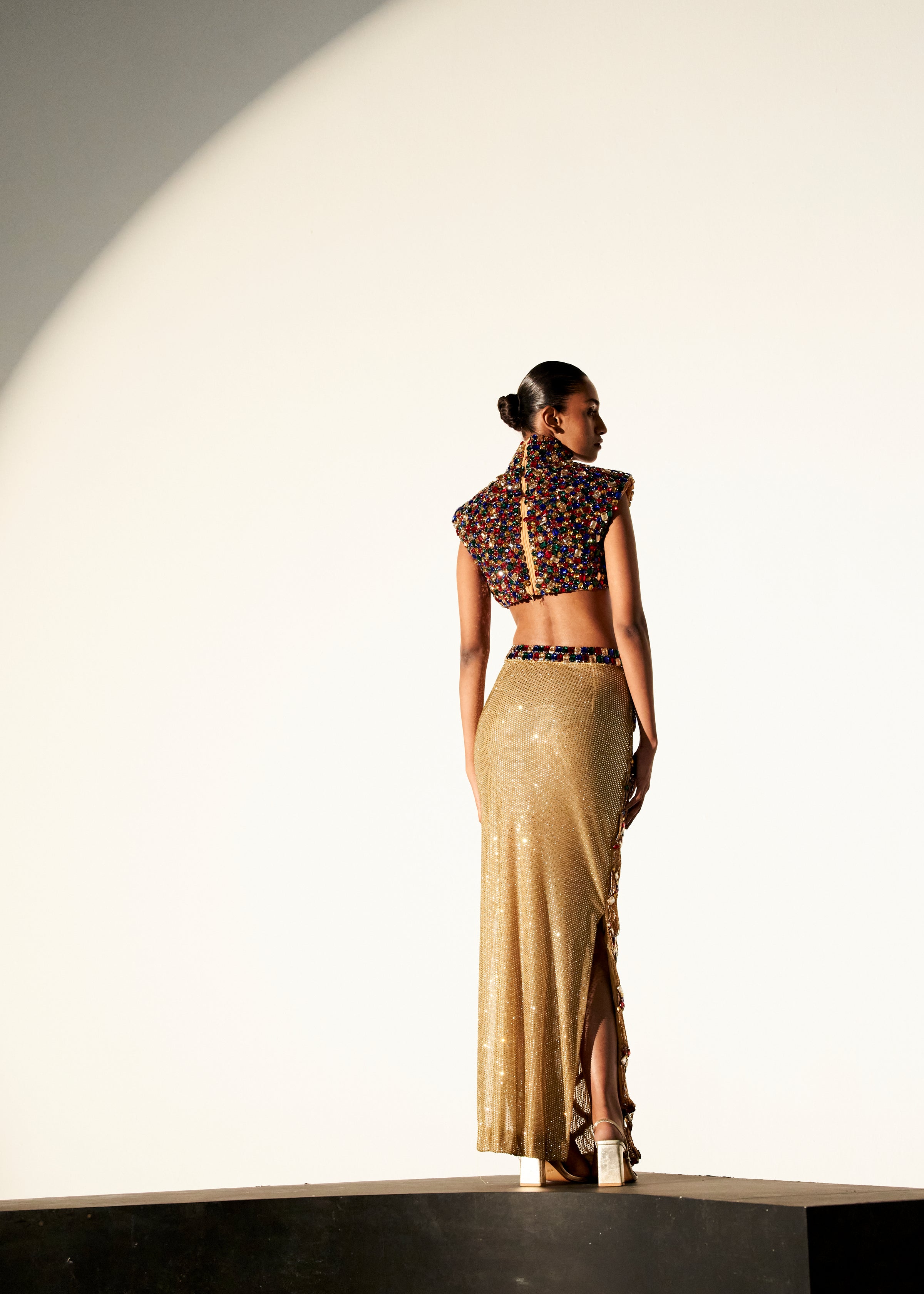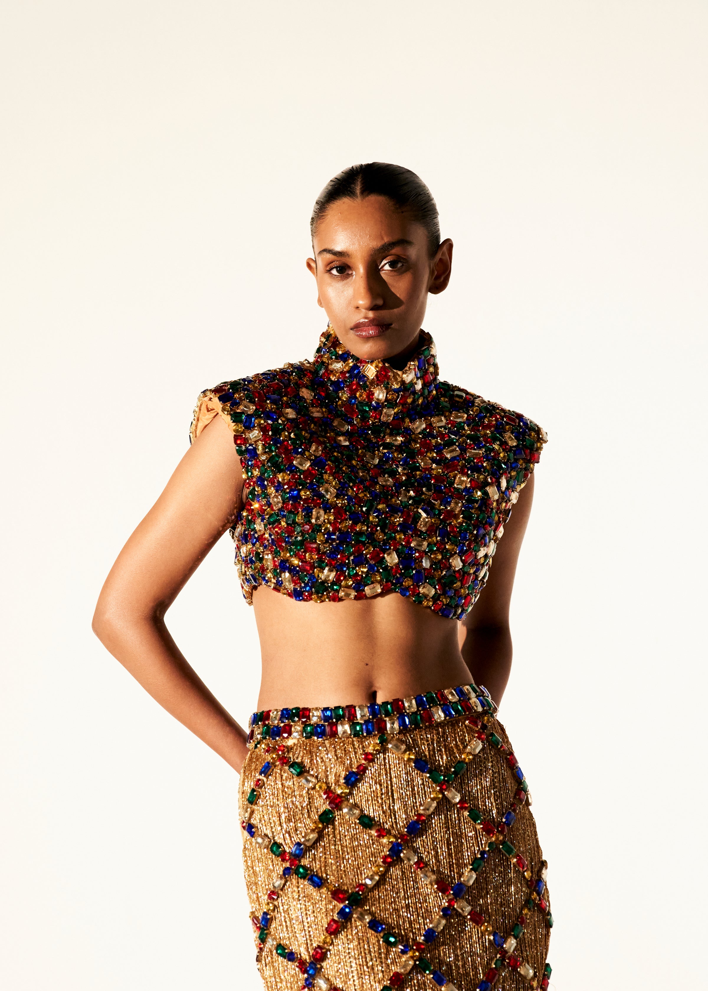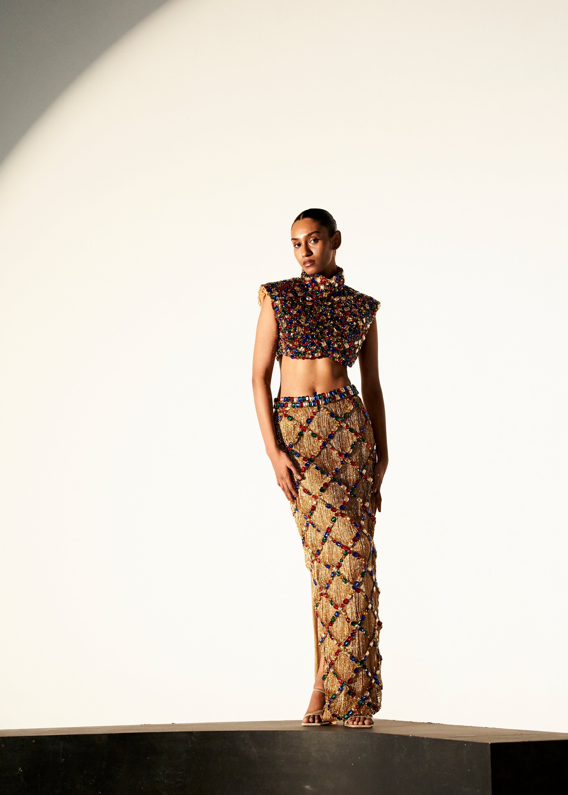 The vibrant multicolored jewel top, adorned with dazzling big crystals, radiates glamour and allure, drawing eyes with its captivating sparkle. Paired with a lattice work skirt, each intricate detail adds depth and texture to the ensemble, creating a mesmerizing effect as you move. Both top and skirt has sheeted fabric back.