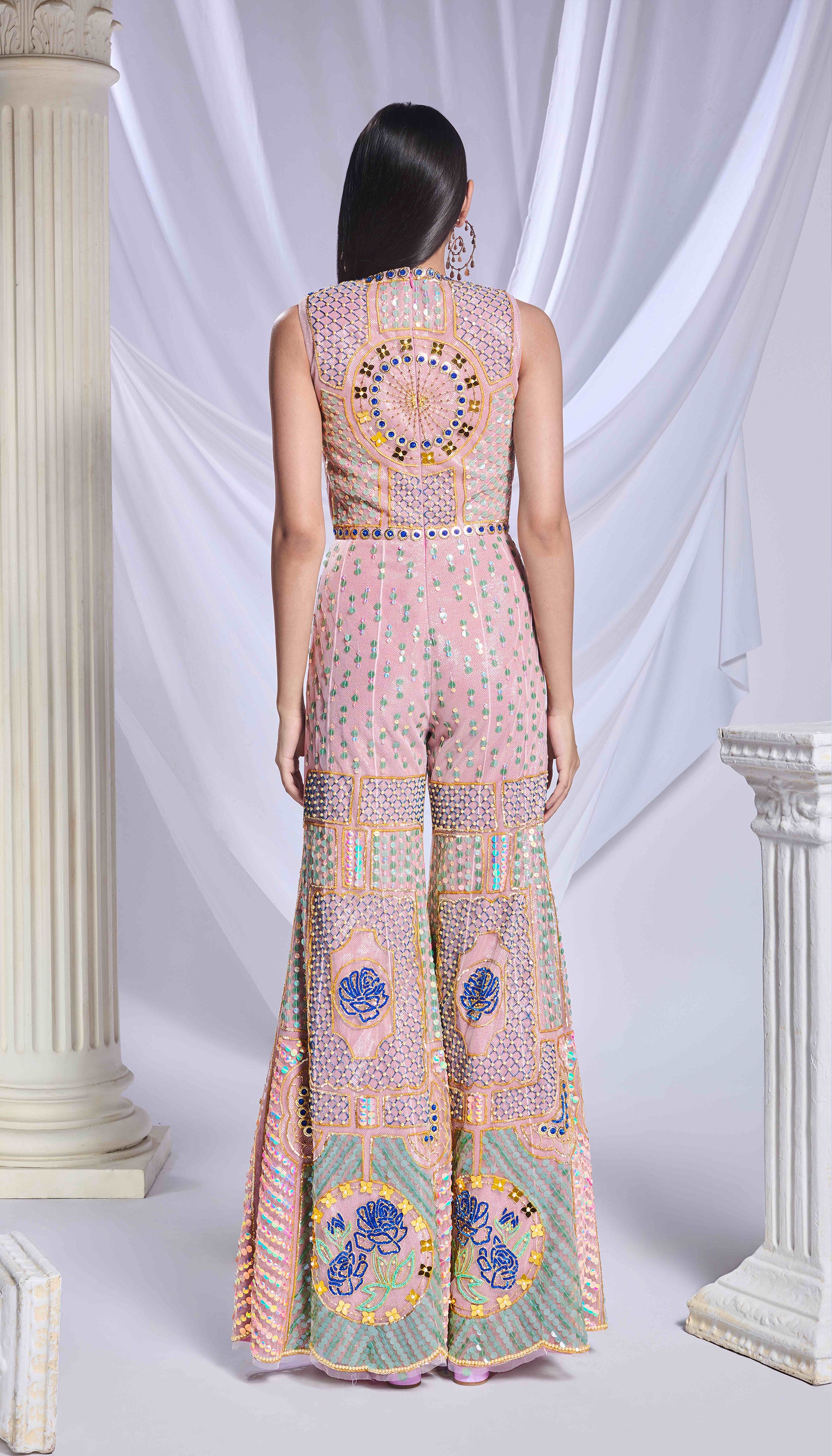A baby pink tulle jumpsuit embroidered with sequins, glass cut beads, pearls and acrylics, attached to the bustier, embroidered with delicate roses, sequins and glass cut beads