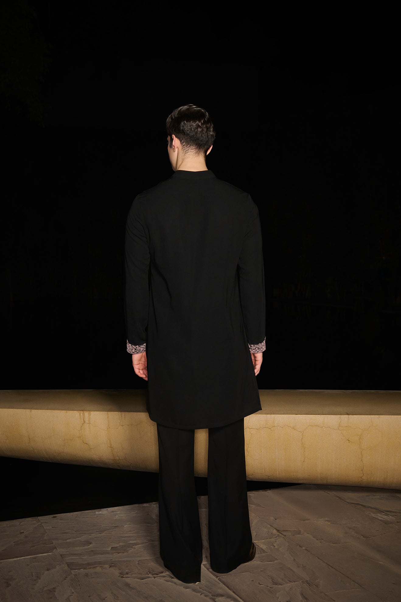 Kurta set featuring geometrical and floral motifs with intricate contrast resham work, paired with tailored pants