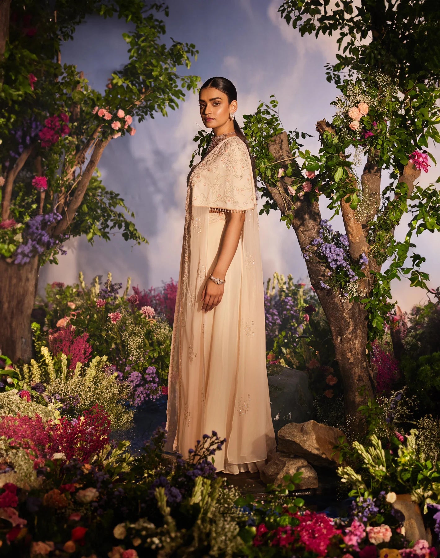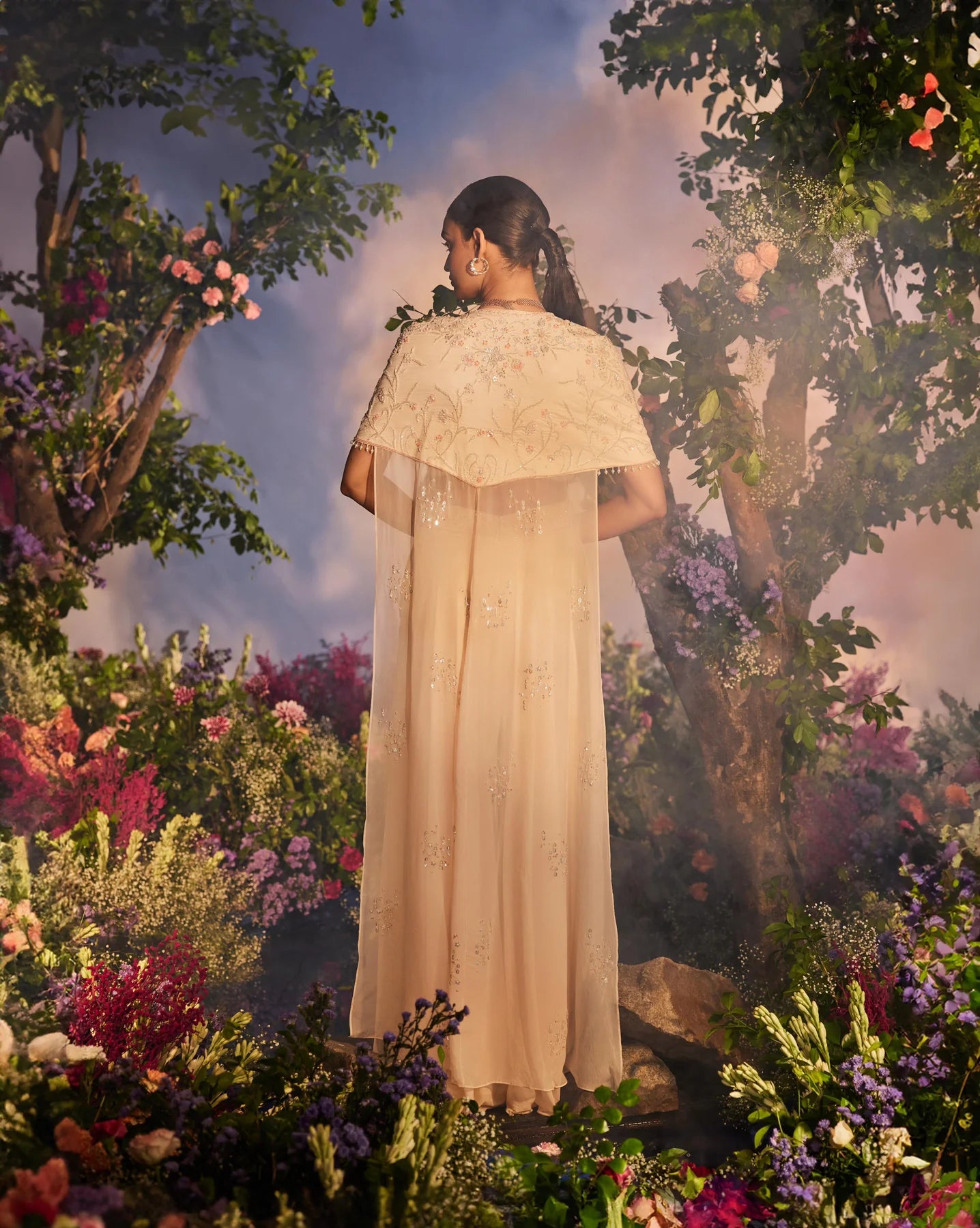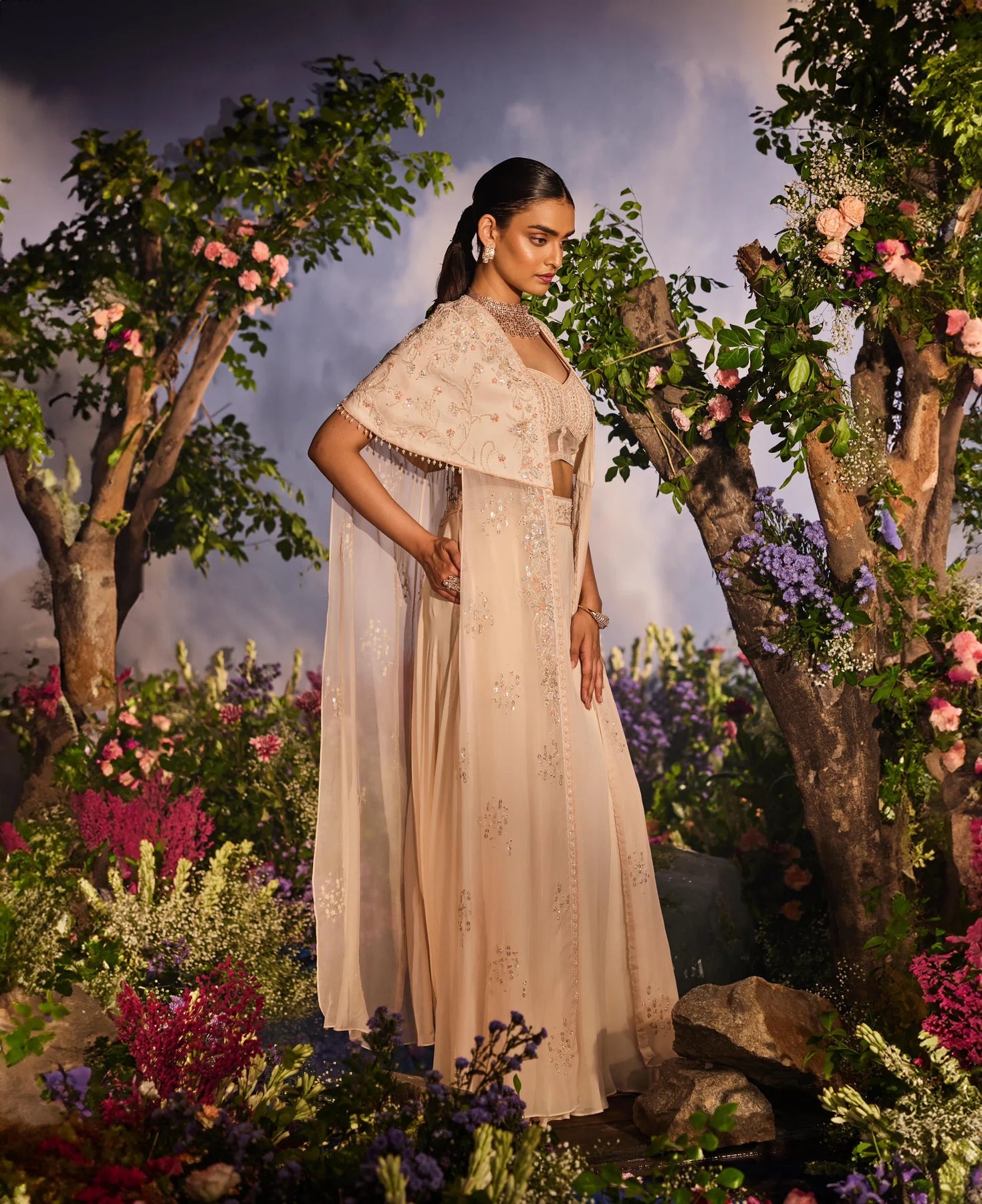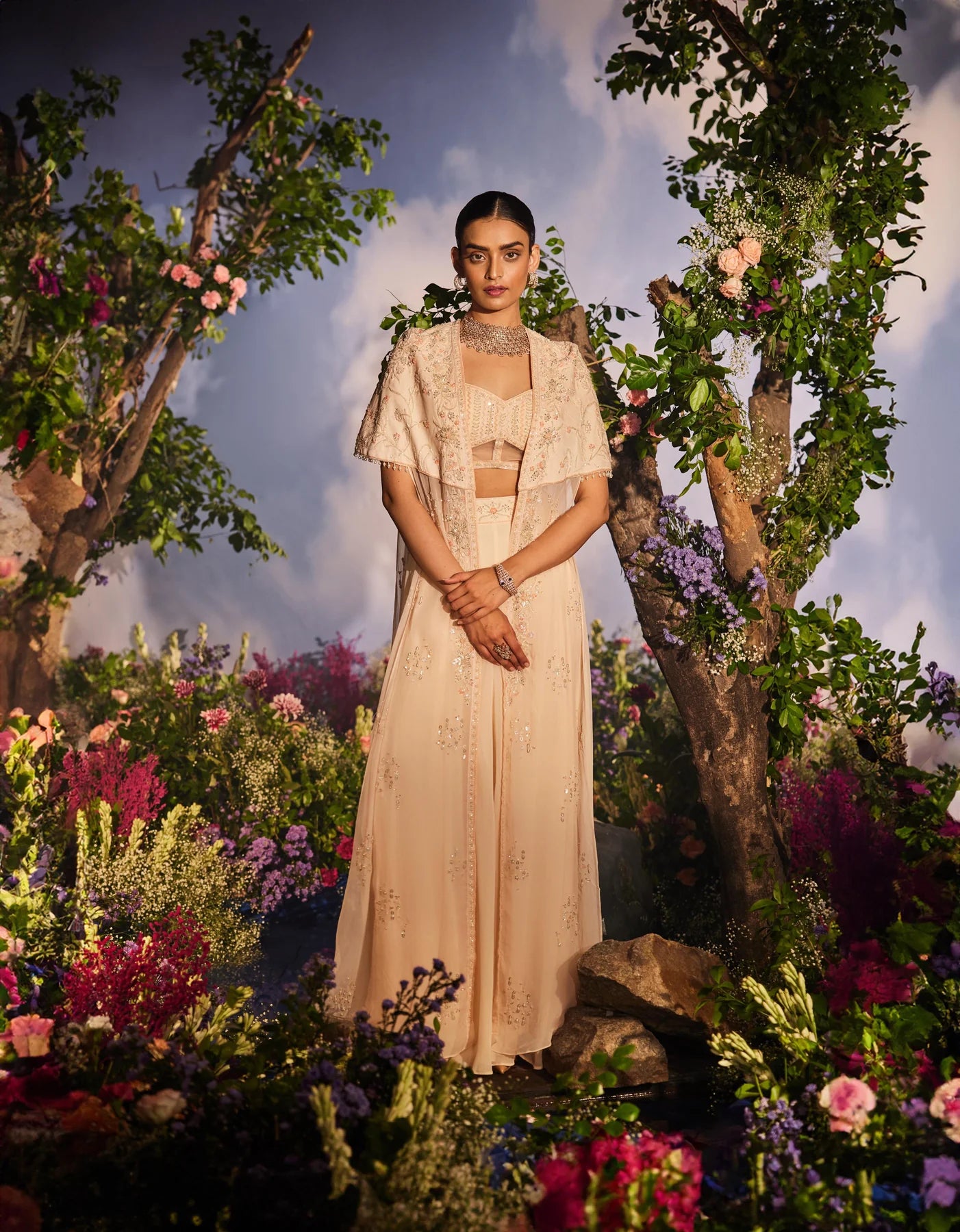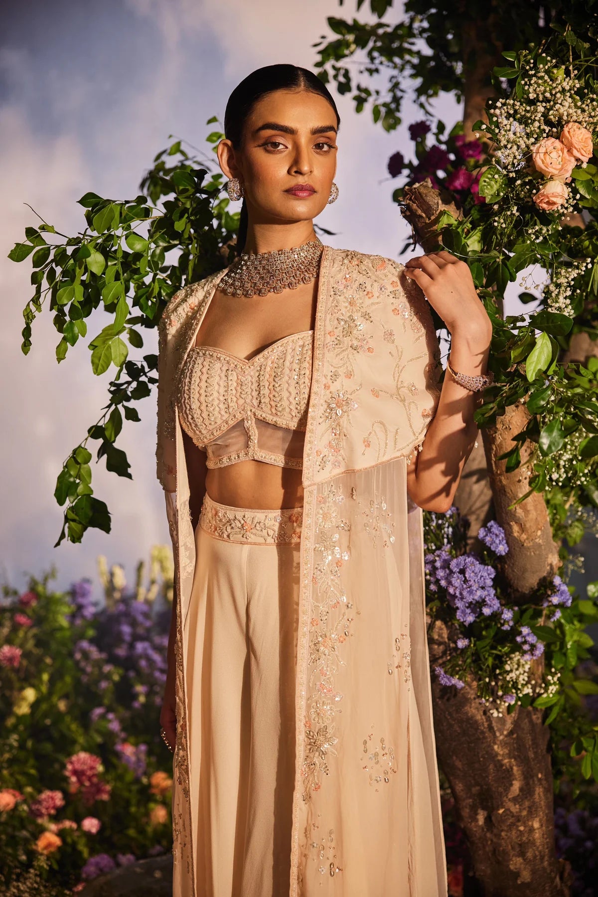 The outfit features a peach cape paired with a corset blouse adorned with intricate knot work embroidery, complemented by cutdana and sequins. It is further styled with a palazzo that has embroidered detailing around the waist to accentuate the waistline.