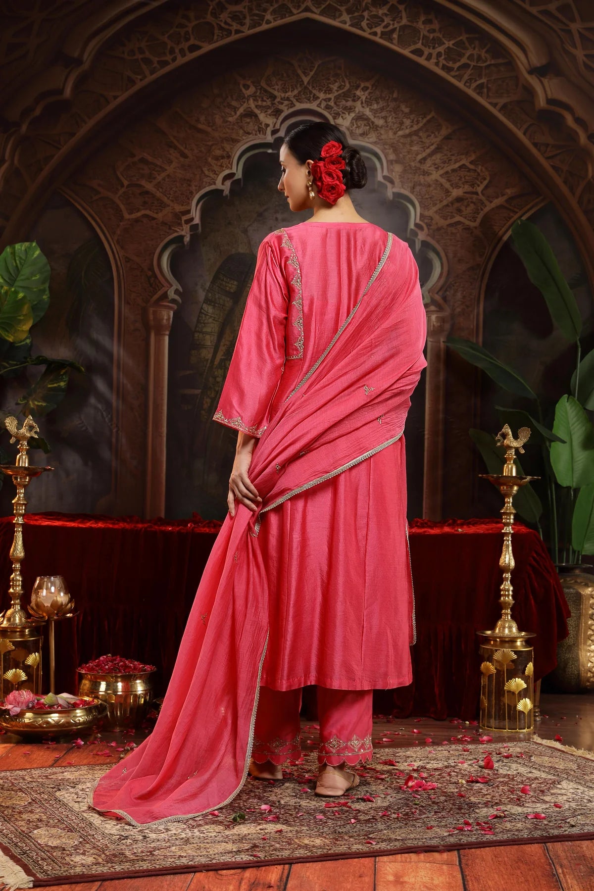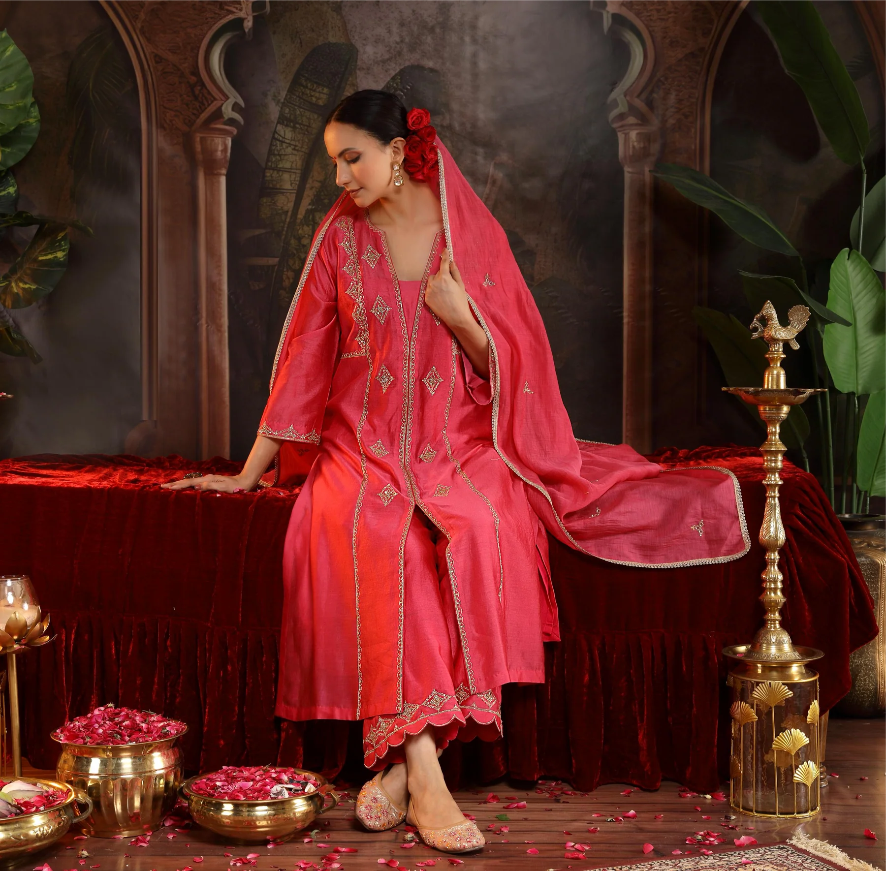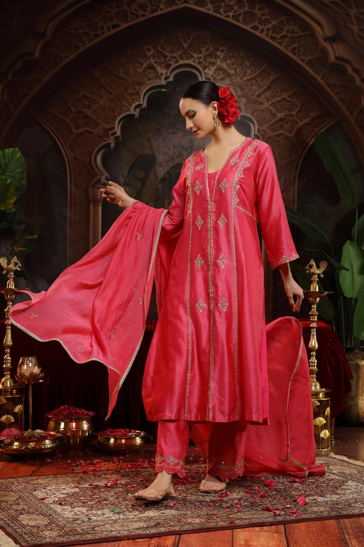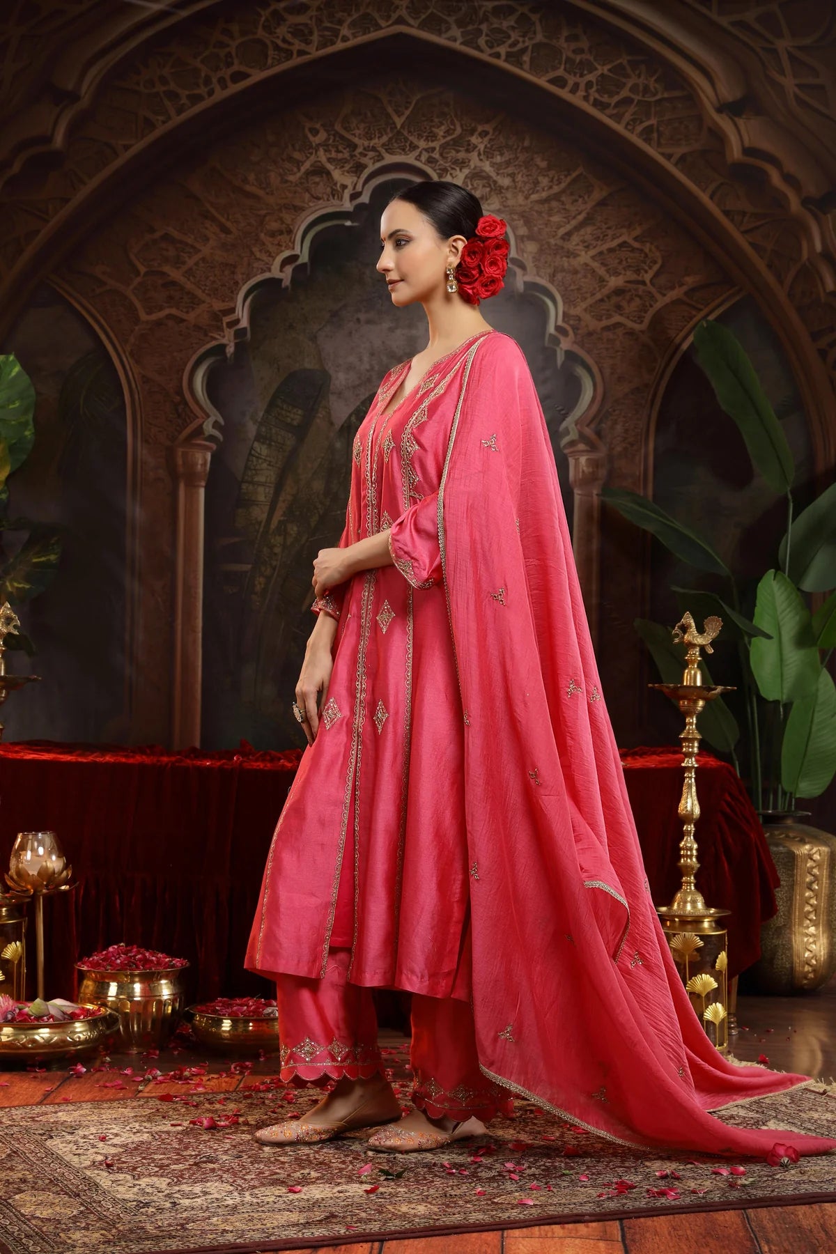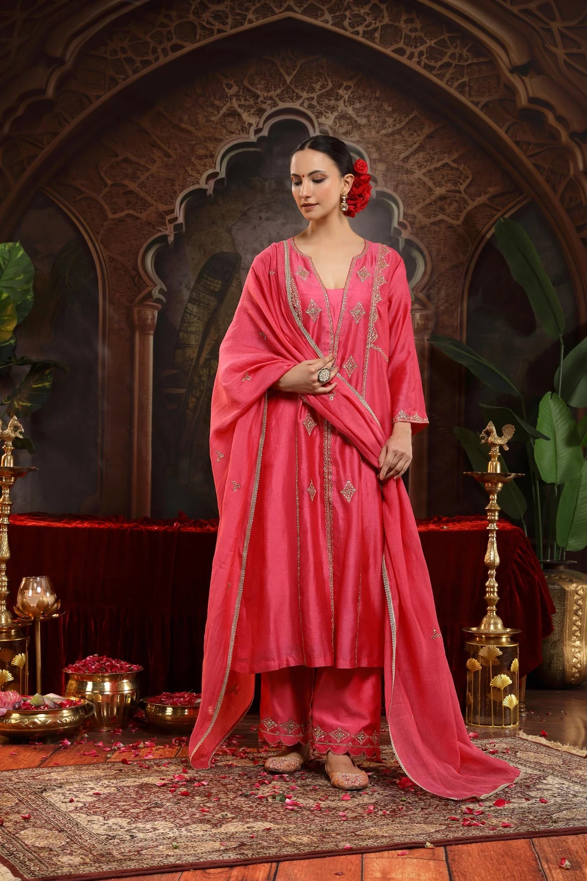 This hot pink A-line suit is a statement in elegance. The kurta features elongated embroidery that follows the V-neckline and continues downward in a structured panel design, adorned with delicate booties, creating a balanced blend of flow and form.