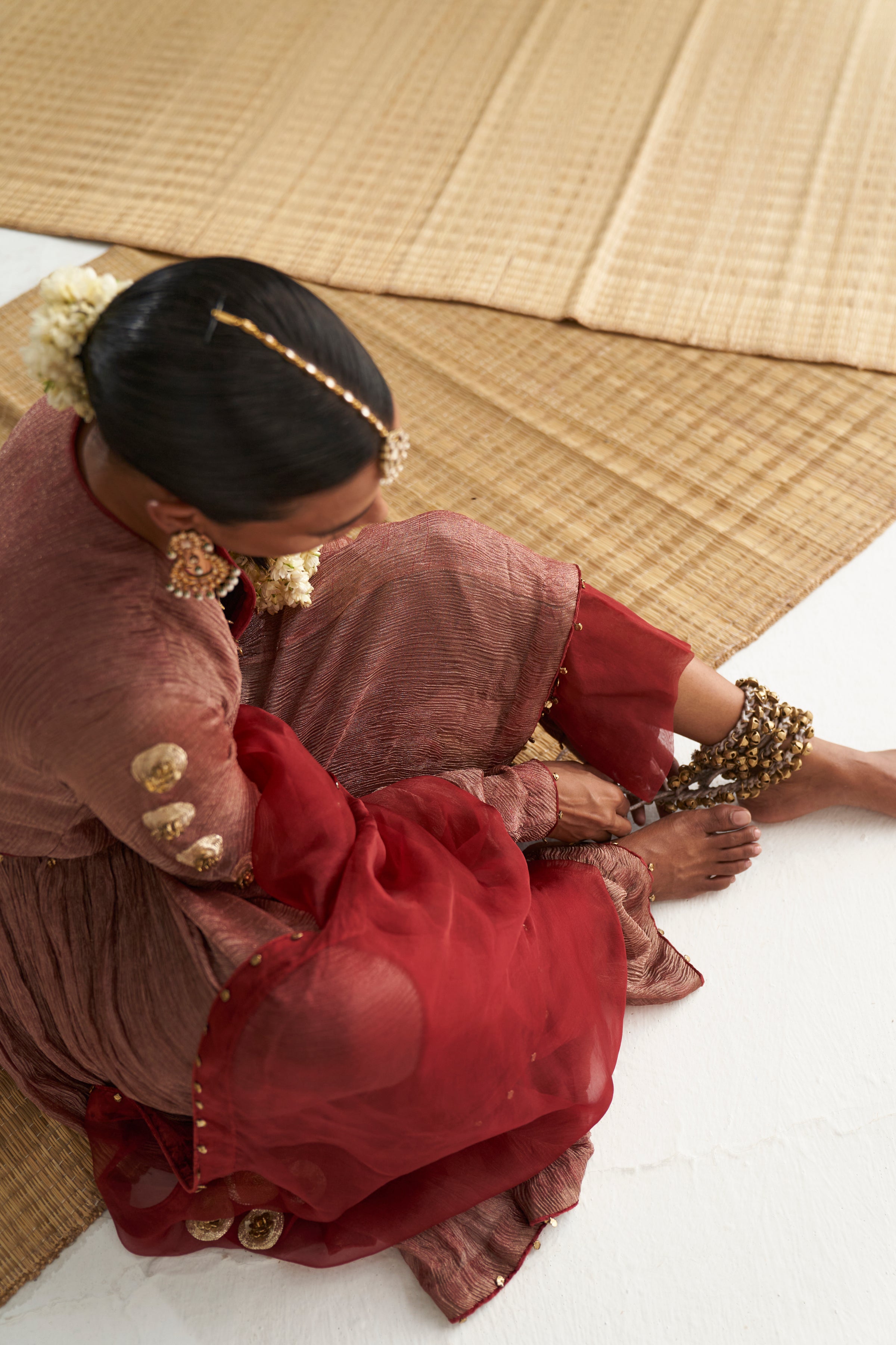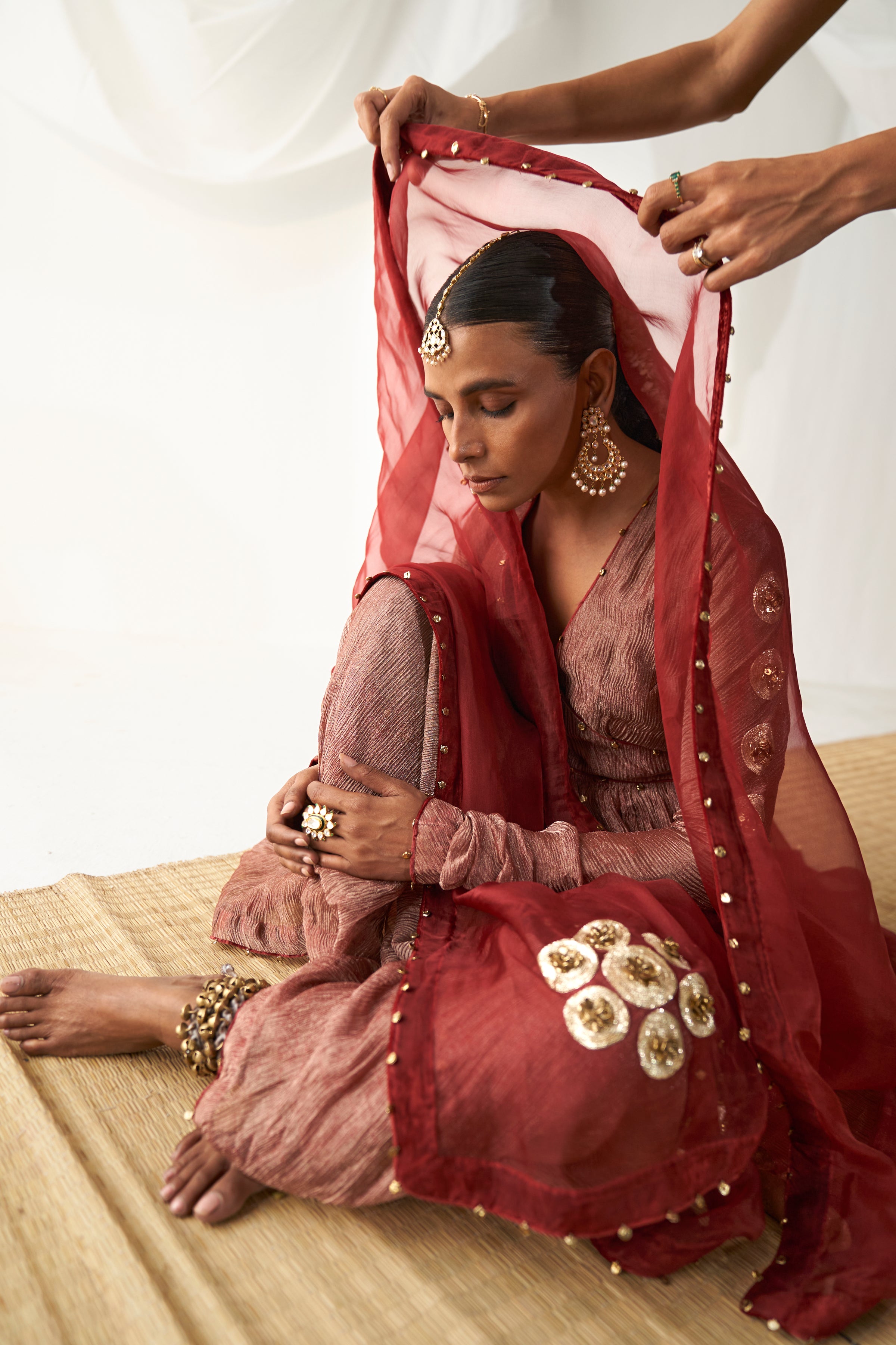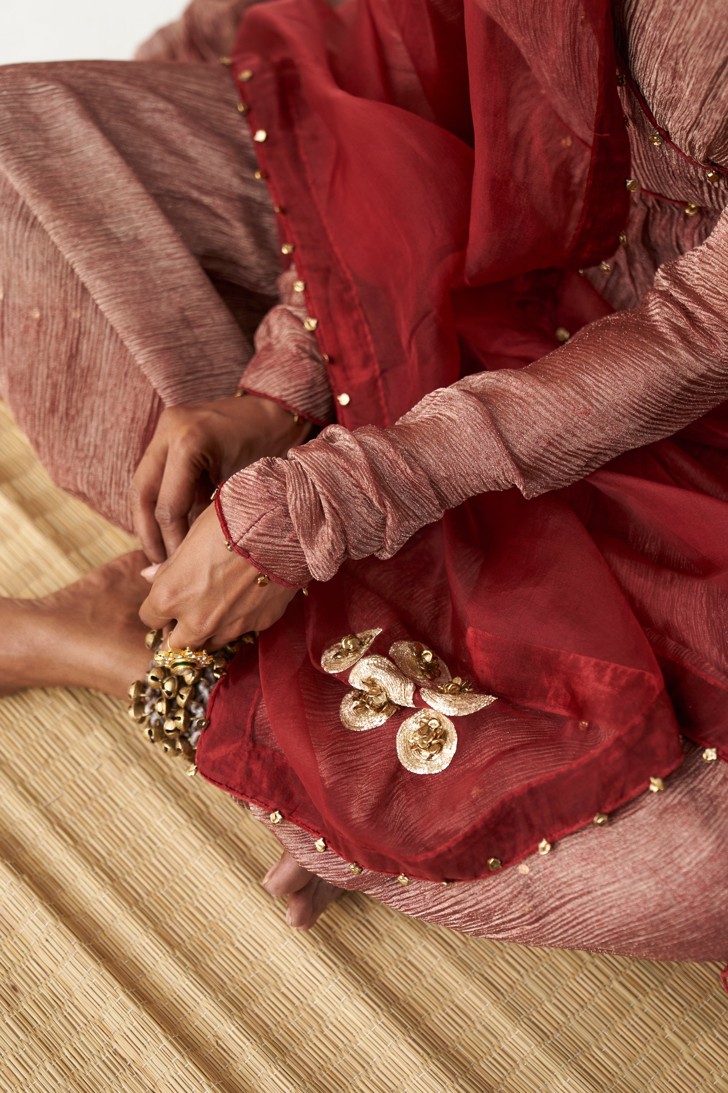 Deep red angrakha with antique dot embellished on churi sleeves paired with fabric blocked culottes pants and organza embroidered dupatta