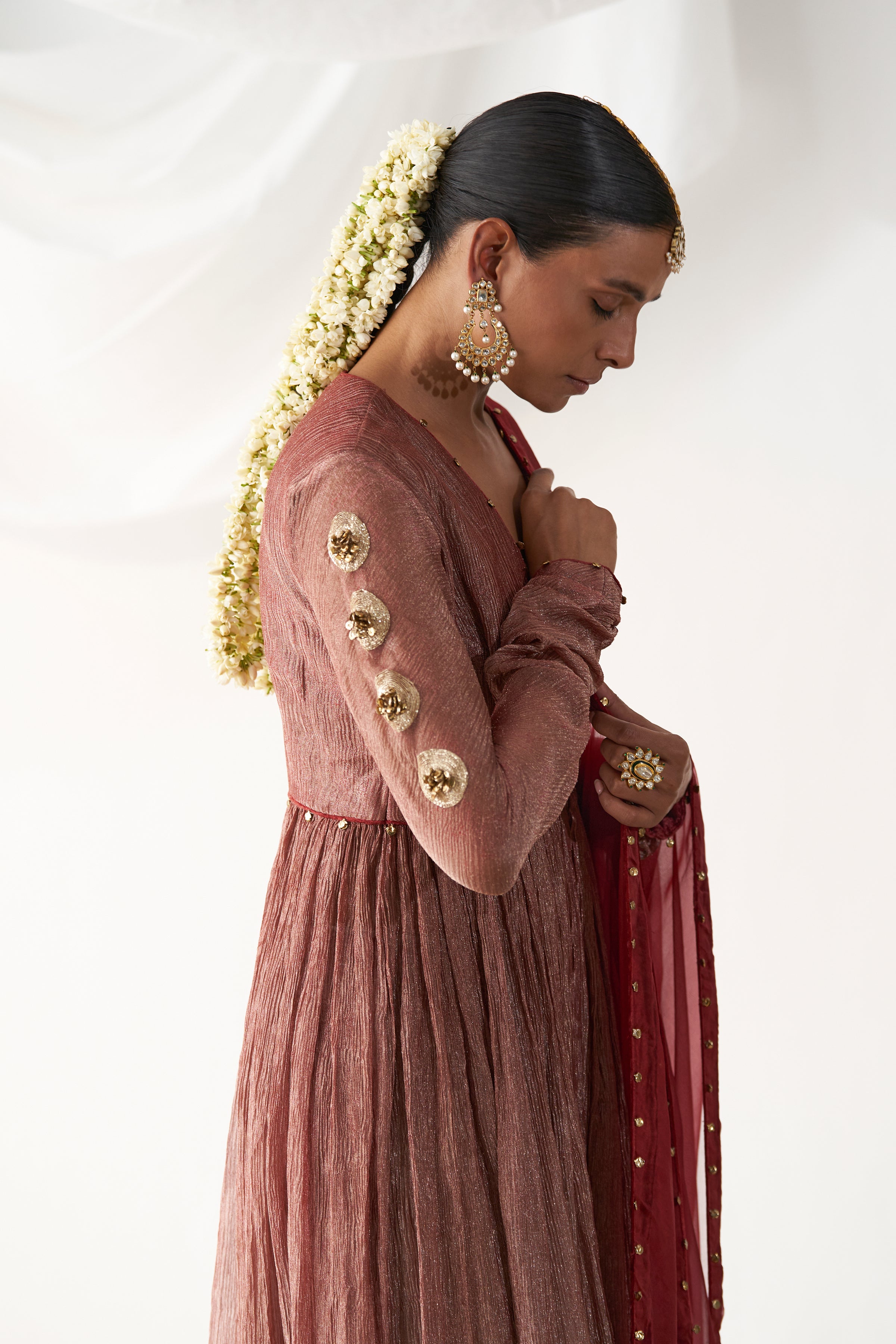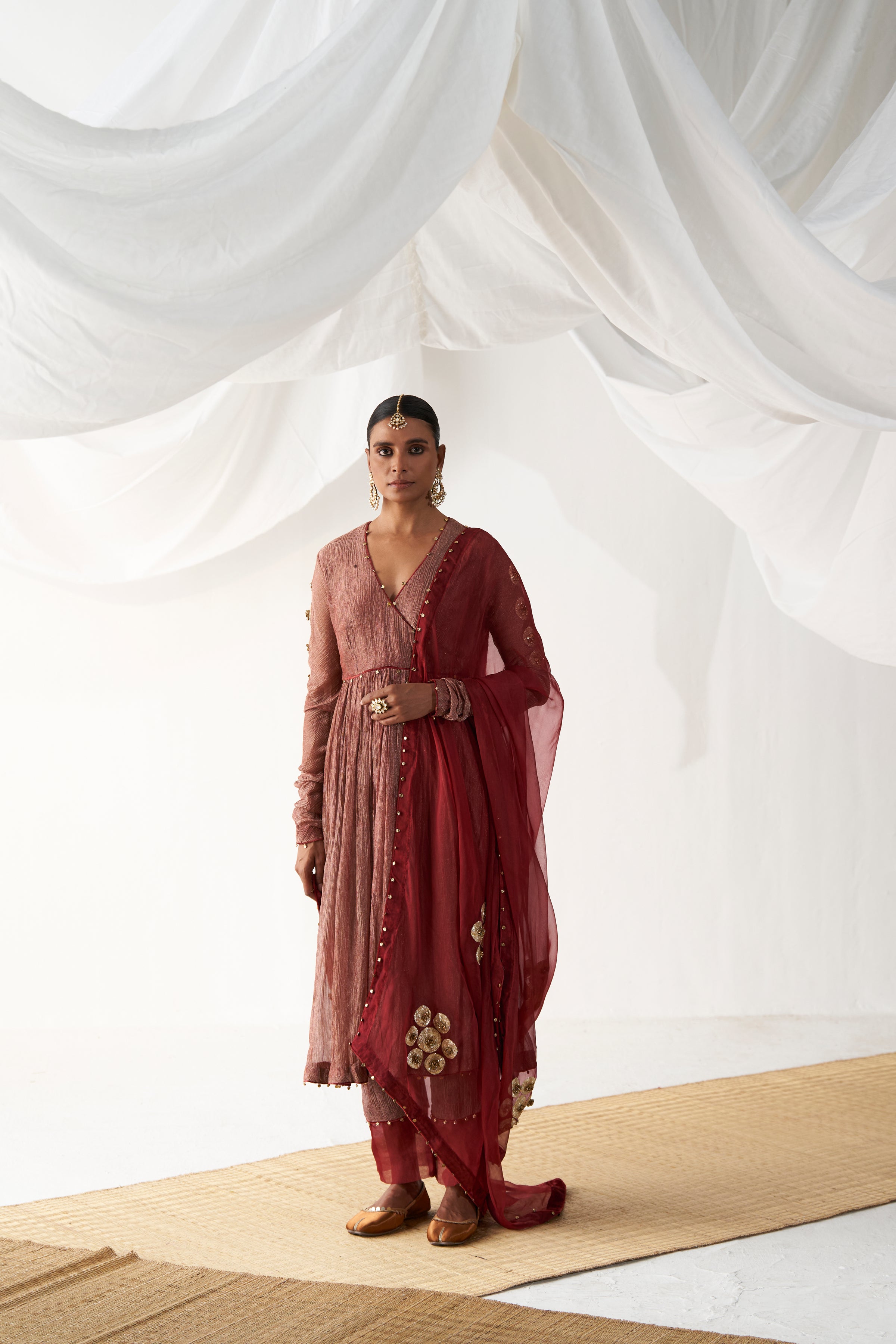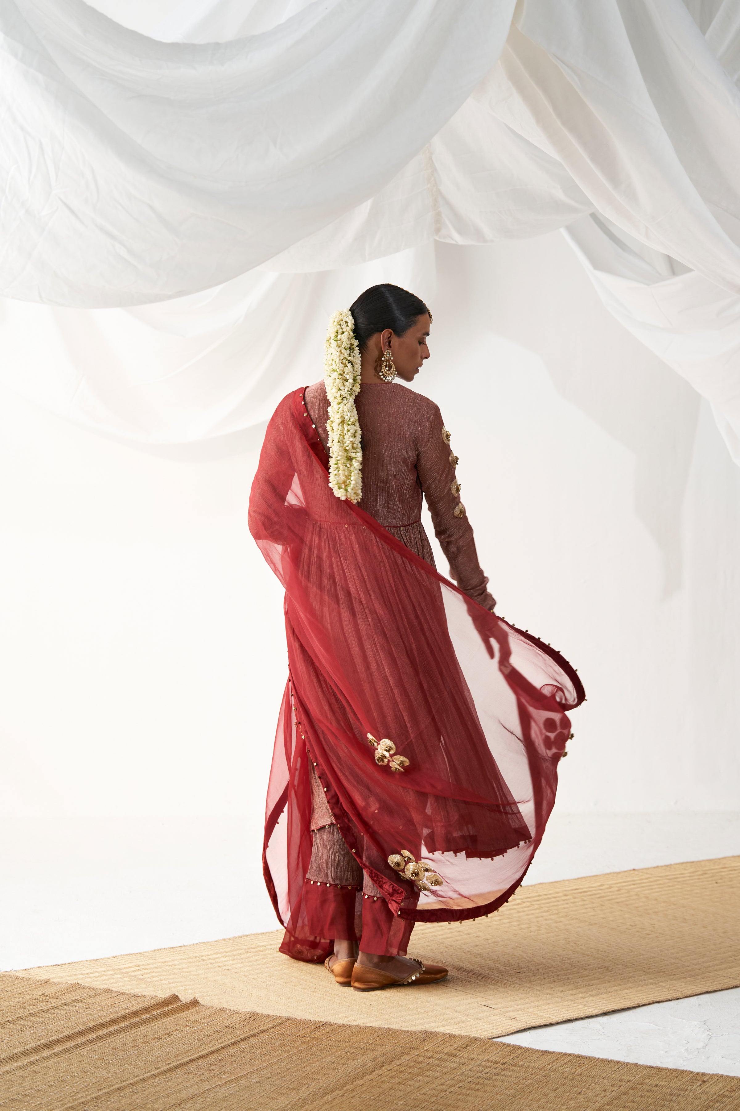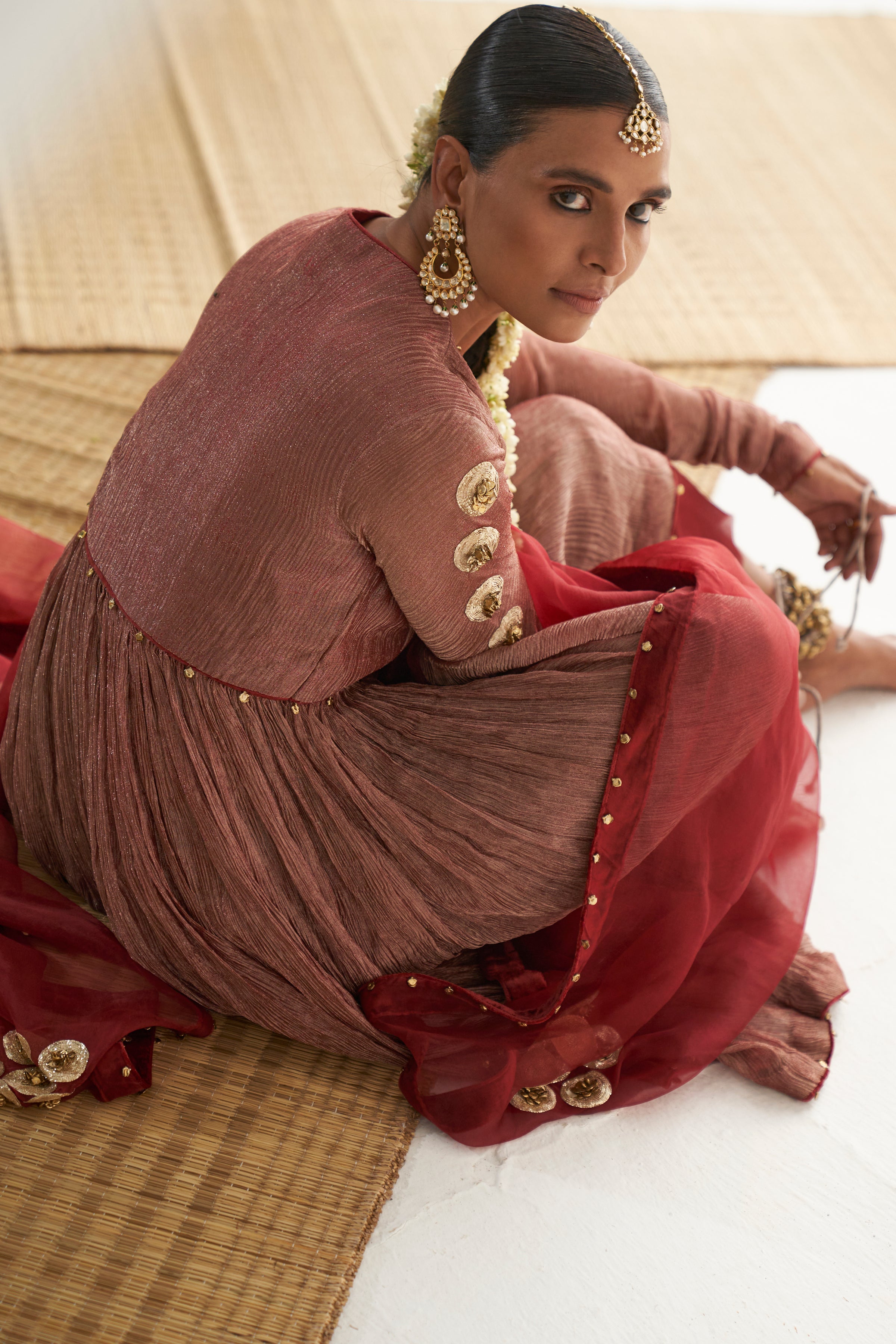 Deep red angrakha with antique dot embellished on churi sleeves paired with fabric blocked culottes pants and organza embroidered dupatta