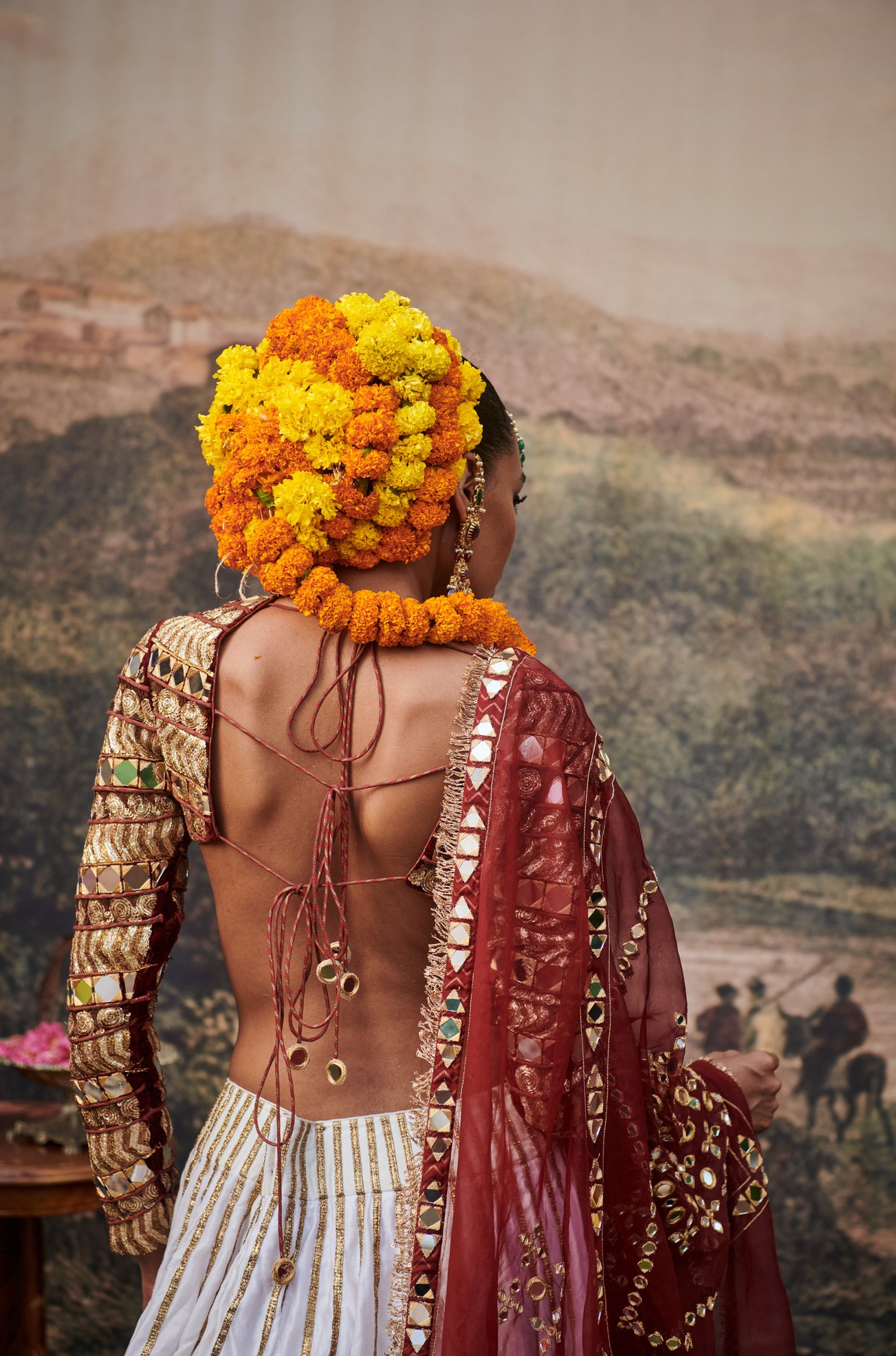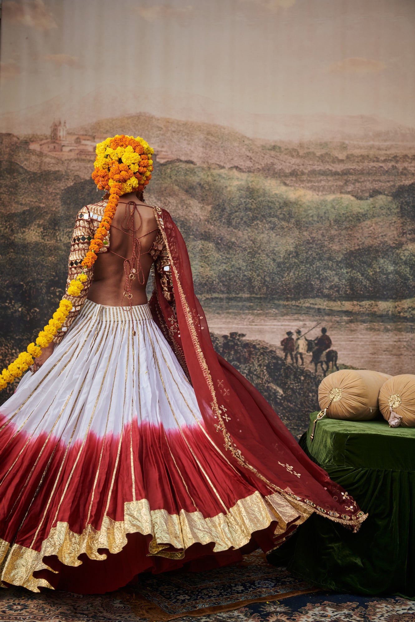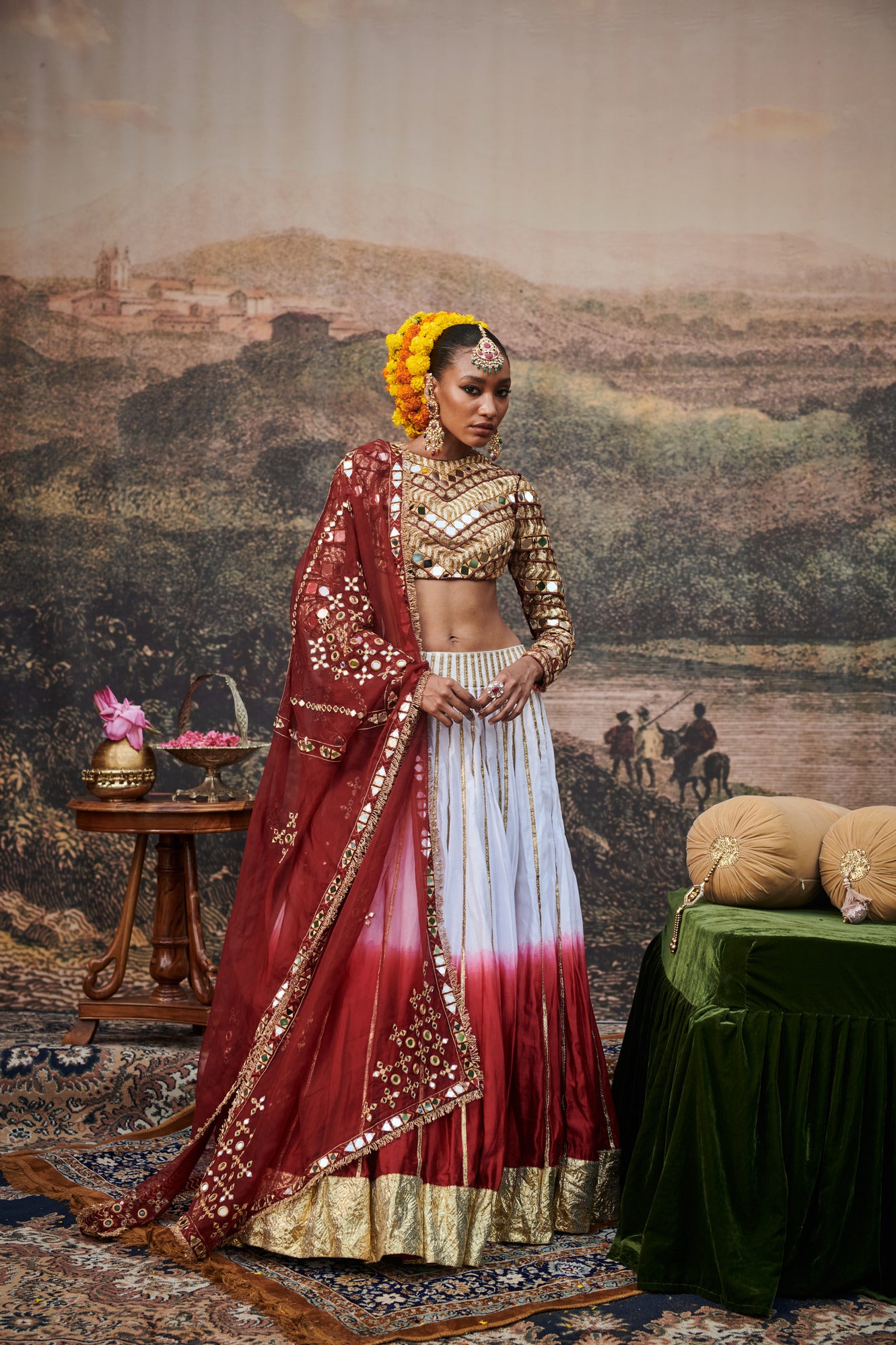 Ombre lehenga showcases a gradient effect, enhanced by a delicate gotta border and vertical gotta stripes on lehenga it is paired with a velvet mirror work blouse and a soft organza dupatta with mirror work on it.