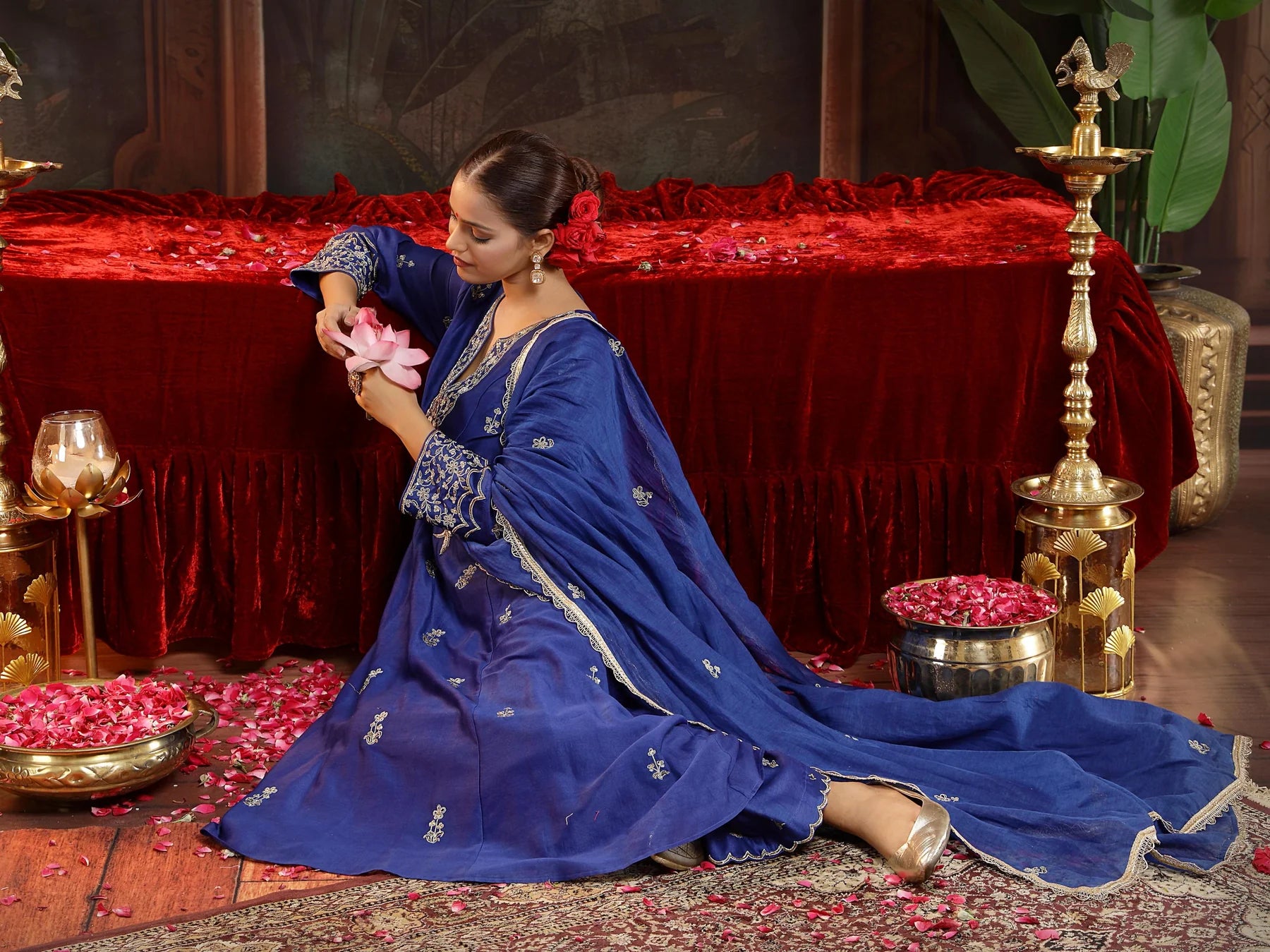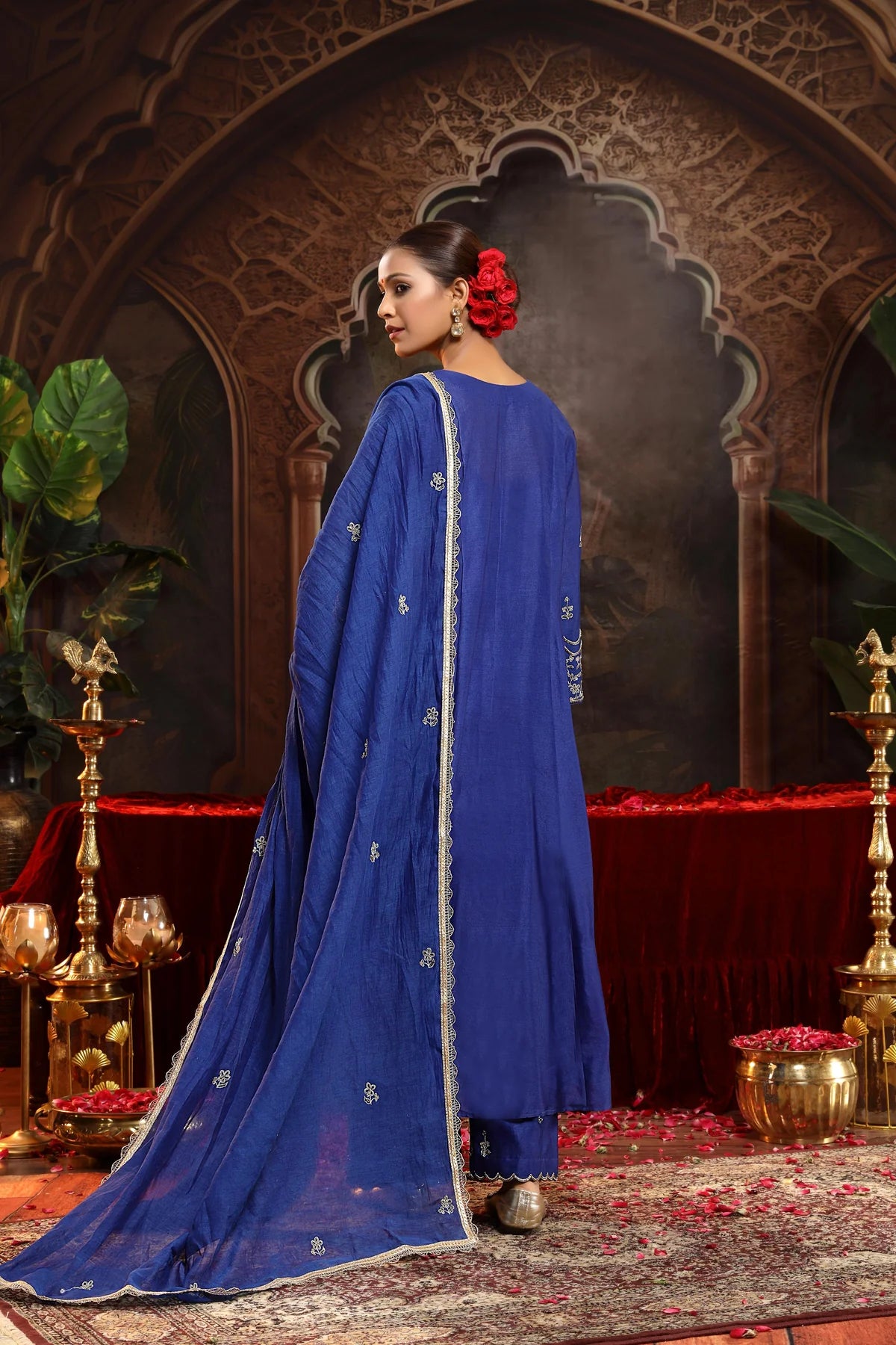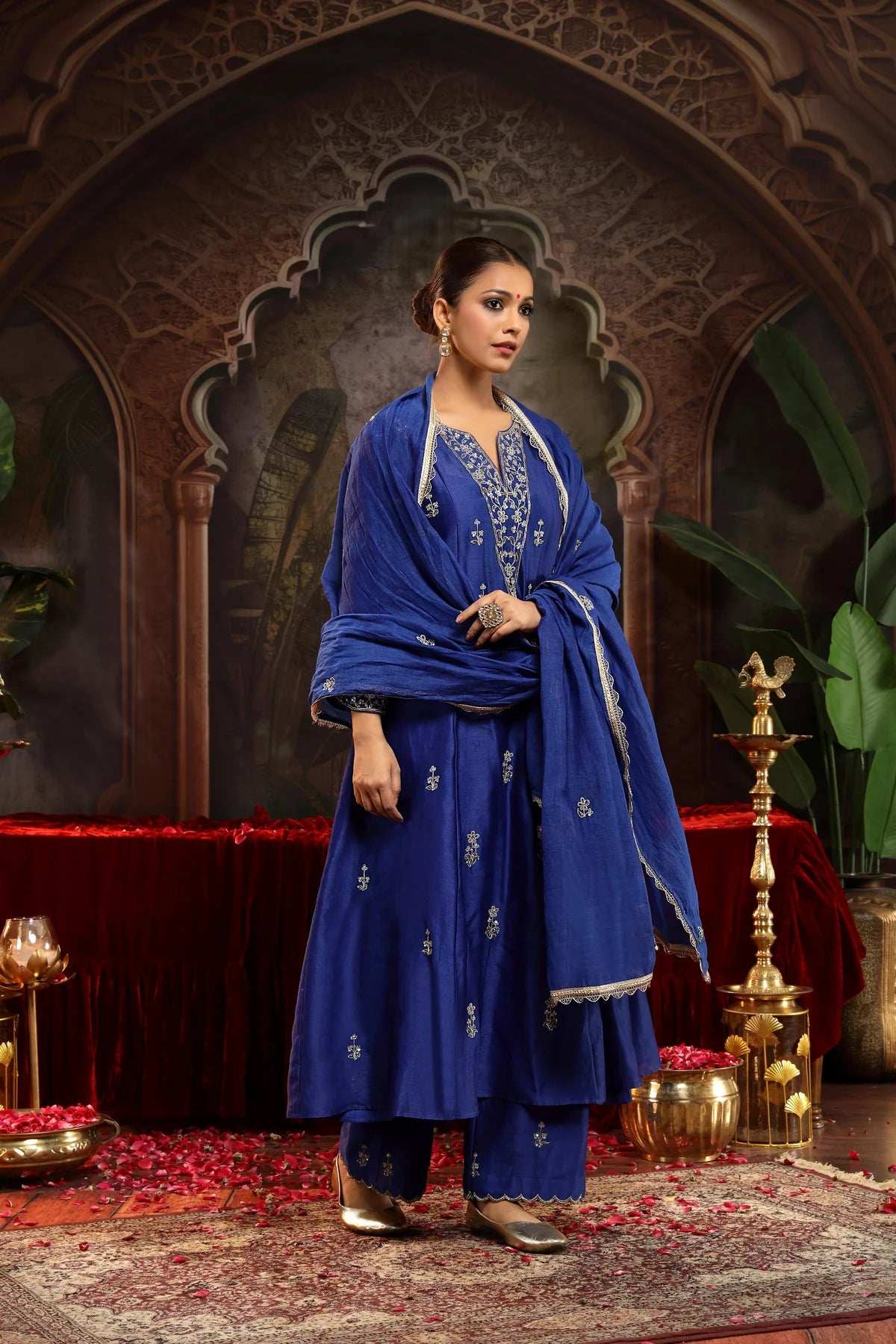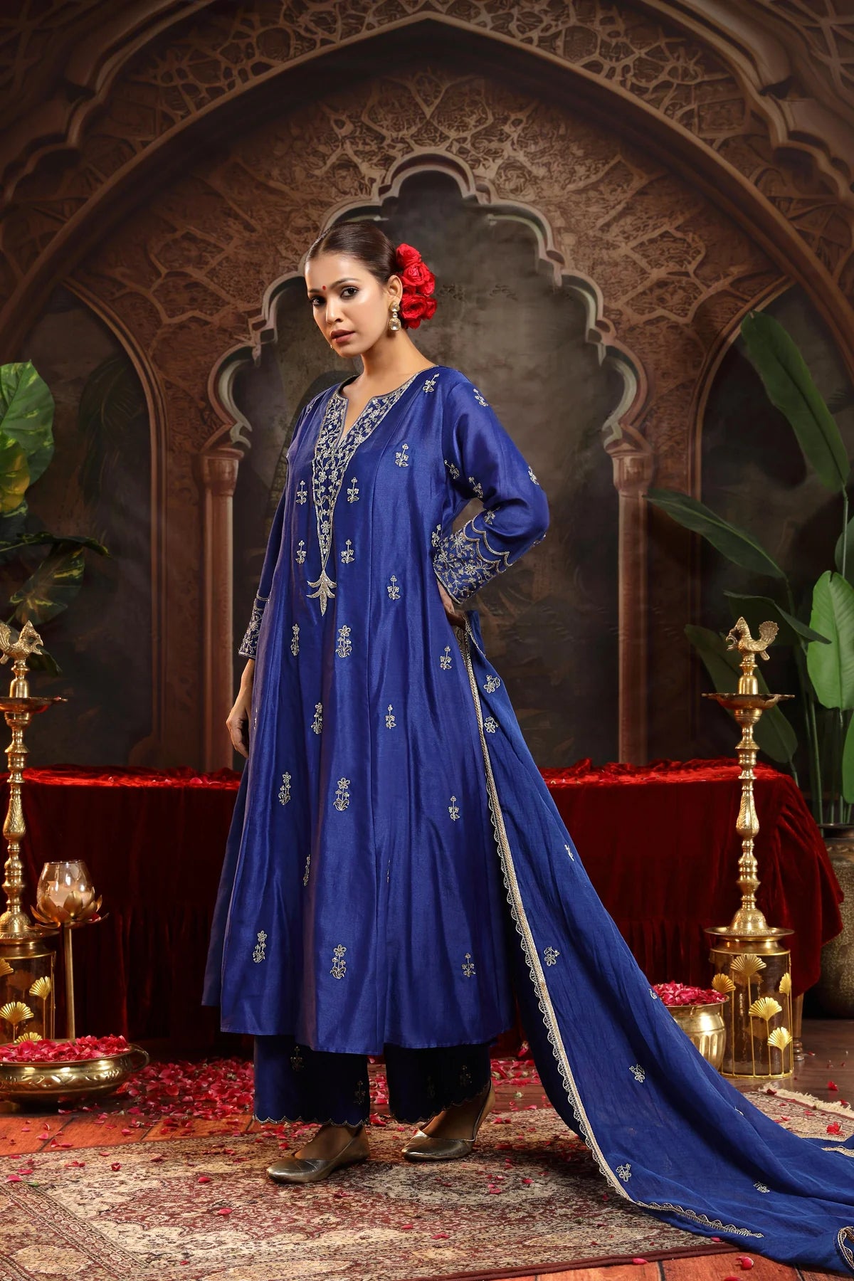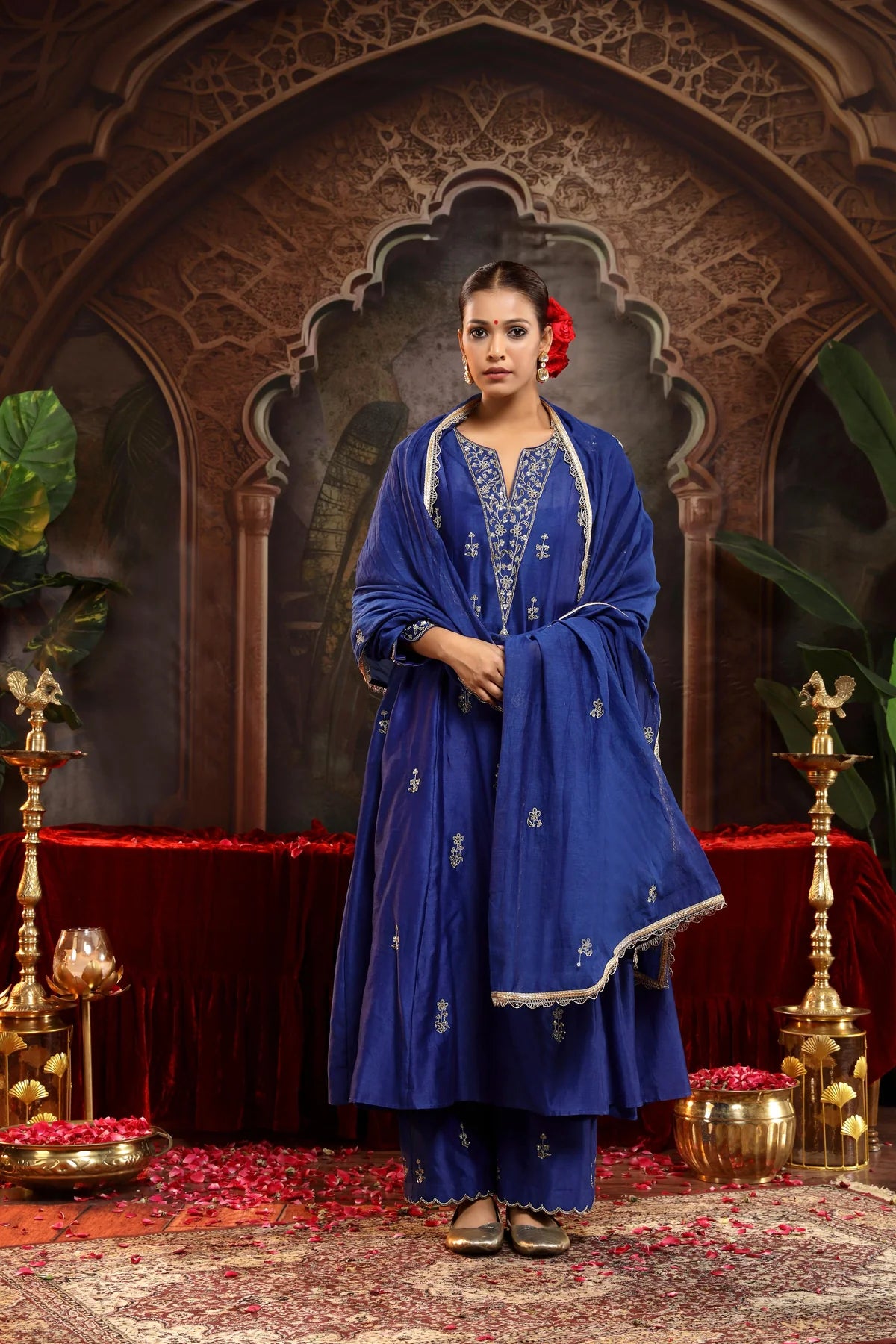 This vibrant blue A-line suit is a beautiful blend of traditional detail and contemporary silhouette. The kurta features V-style embroidery on the yoke, gracefully drawing attention to the neckline, while scattered booties across the body add subtle charm and texture.