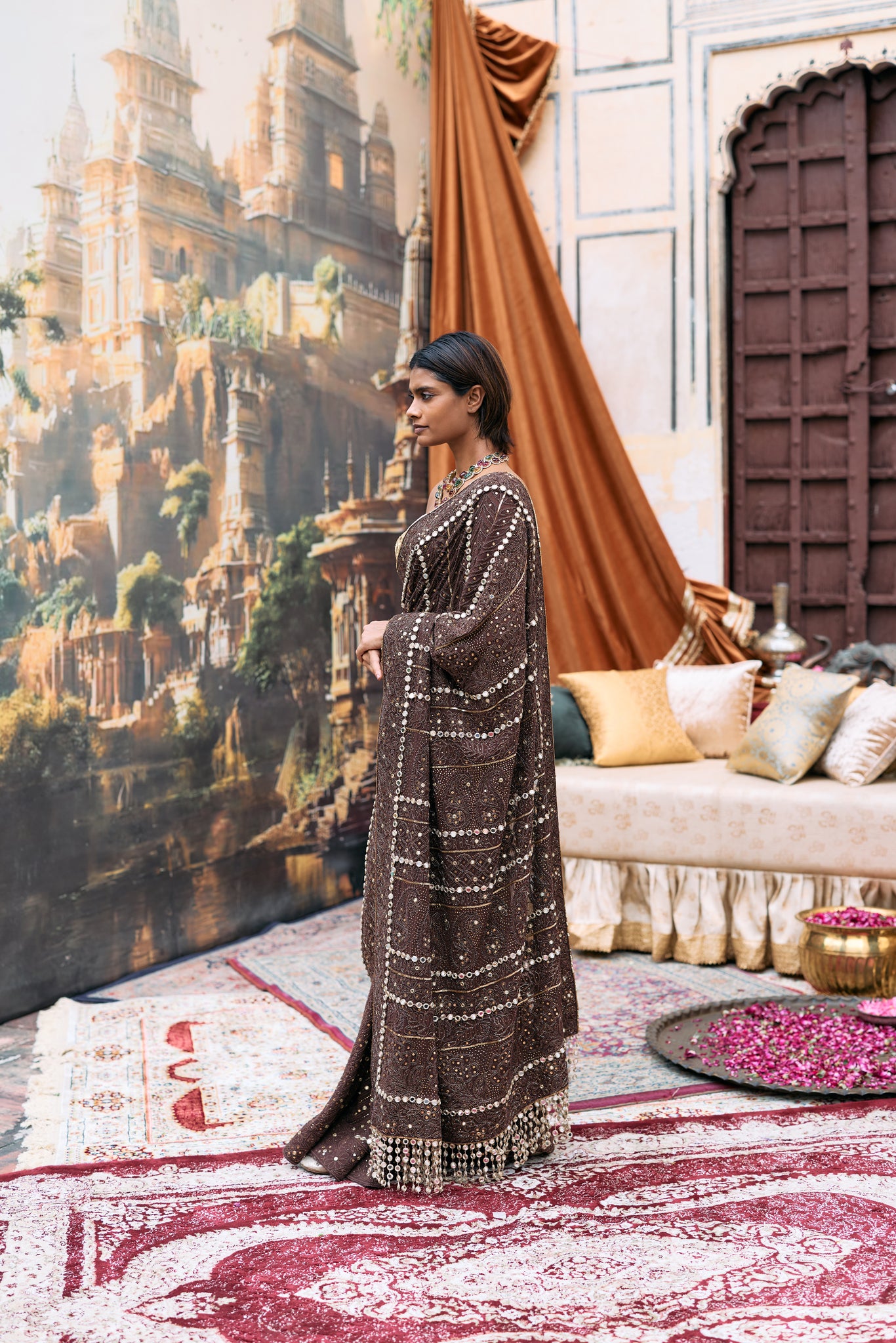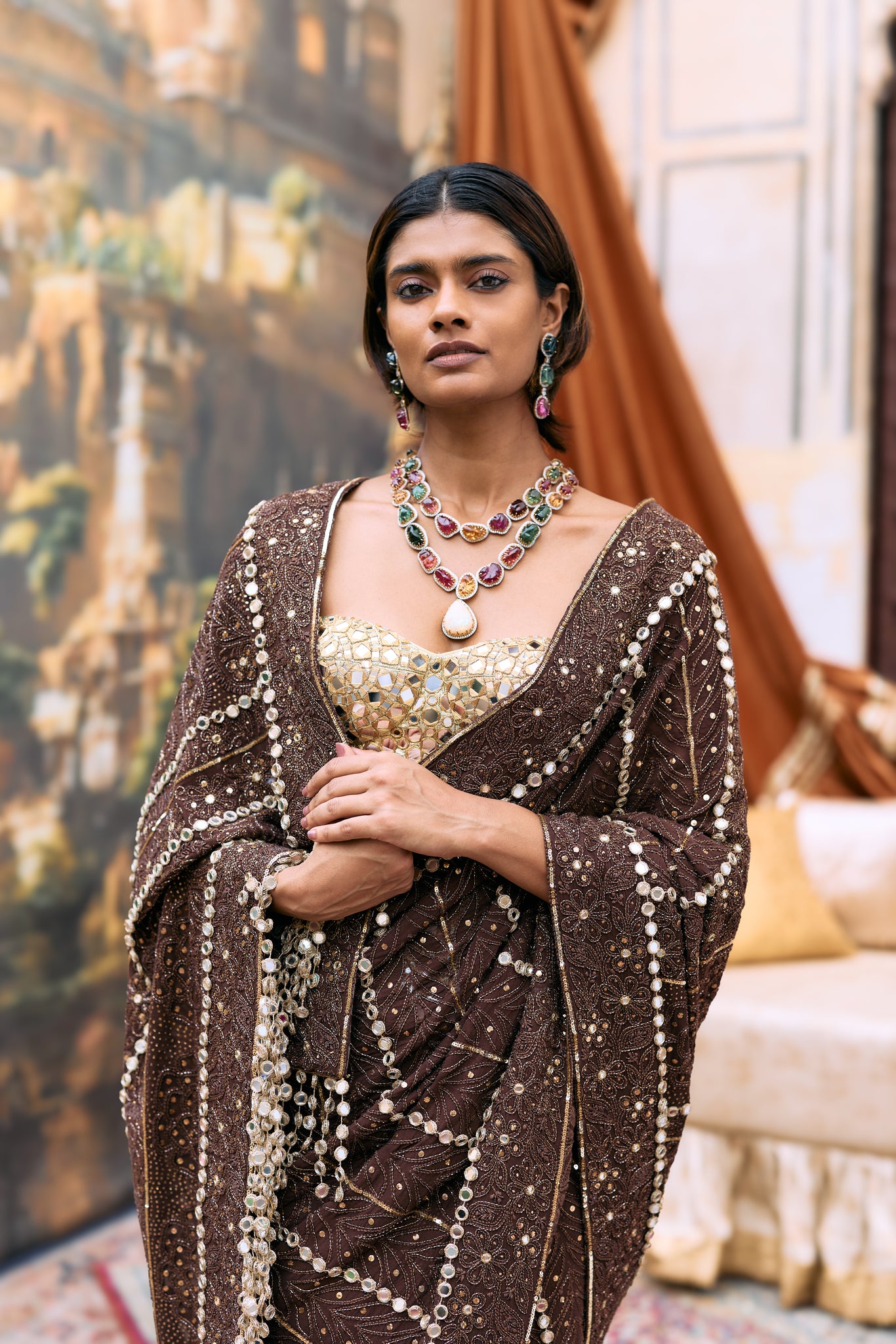 Our signature long mirror corset paired with an intricate embroidered maroon chikankari saree.