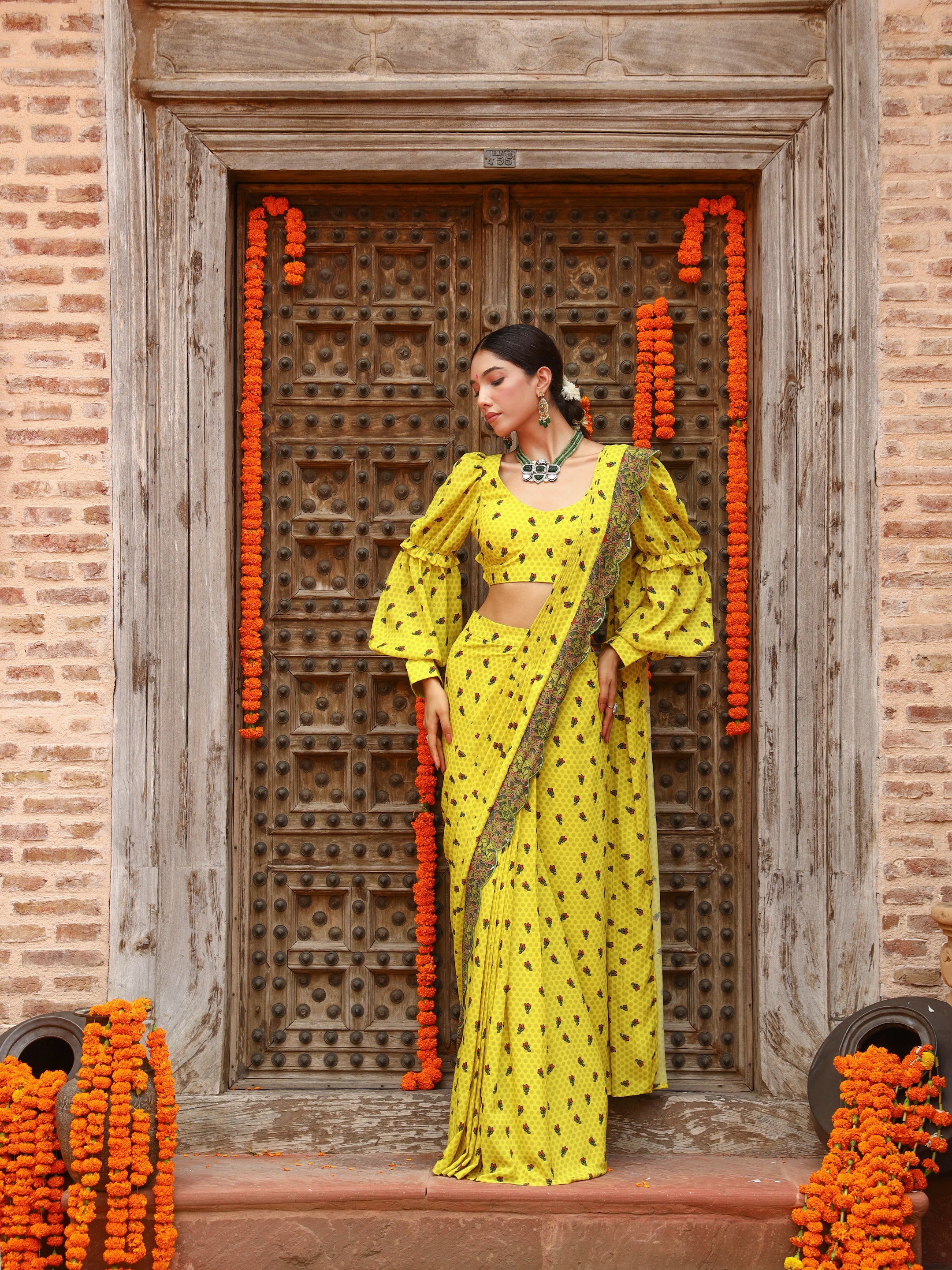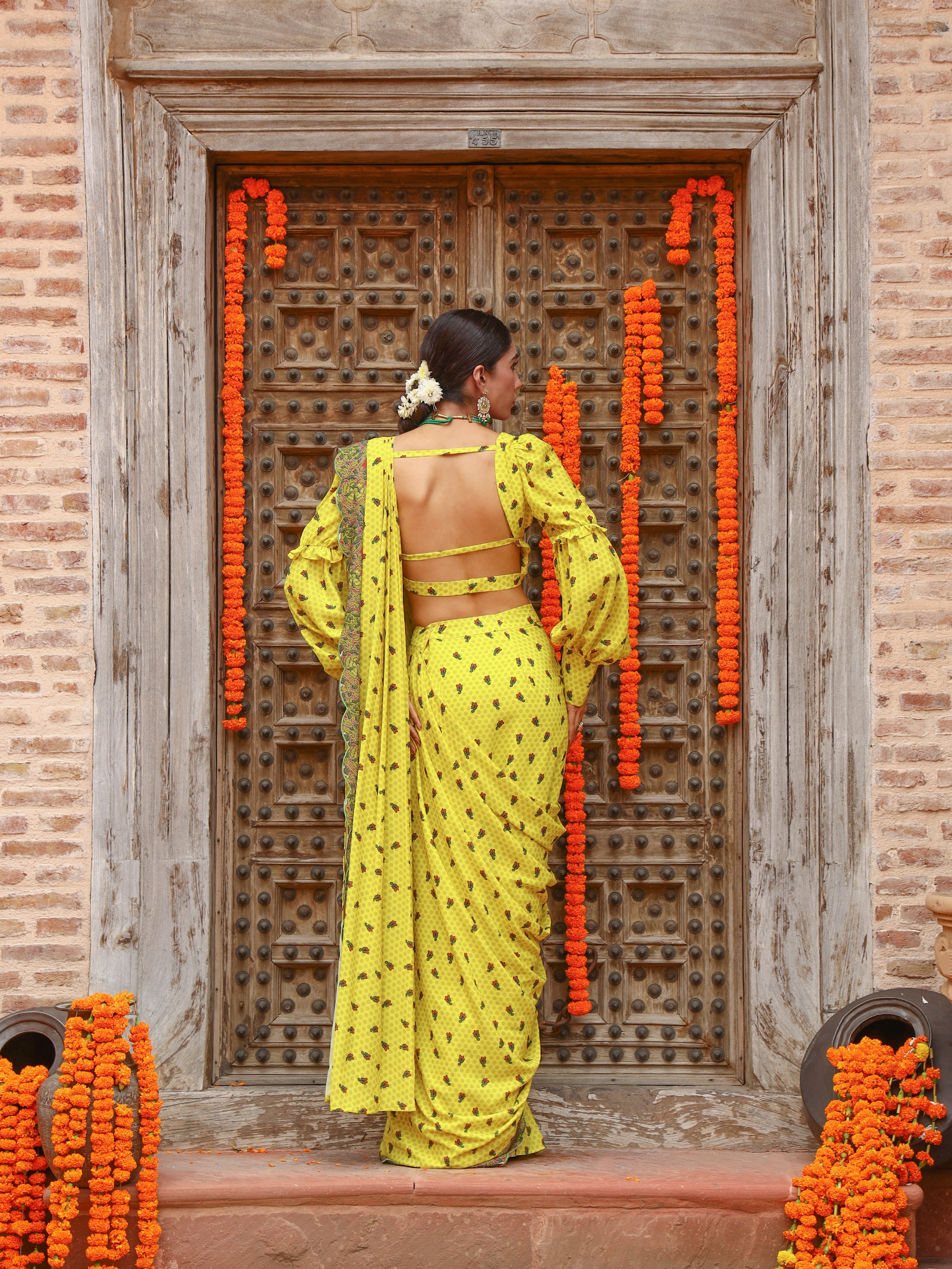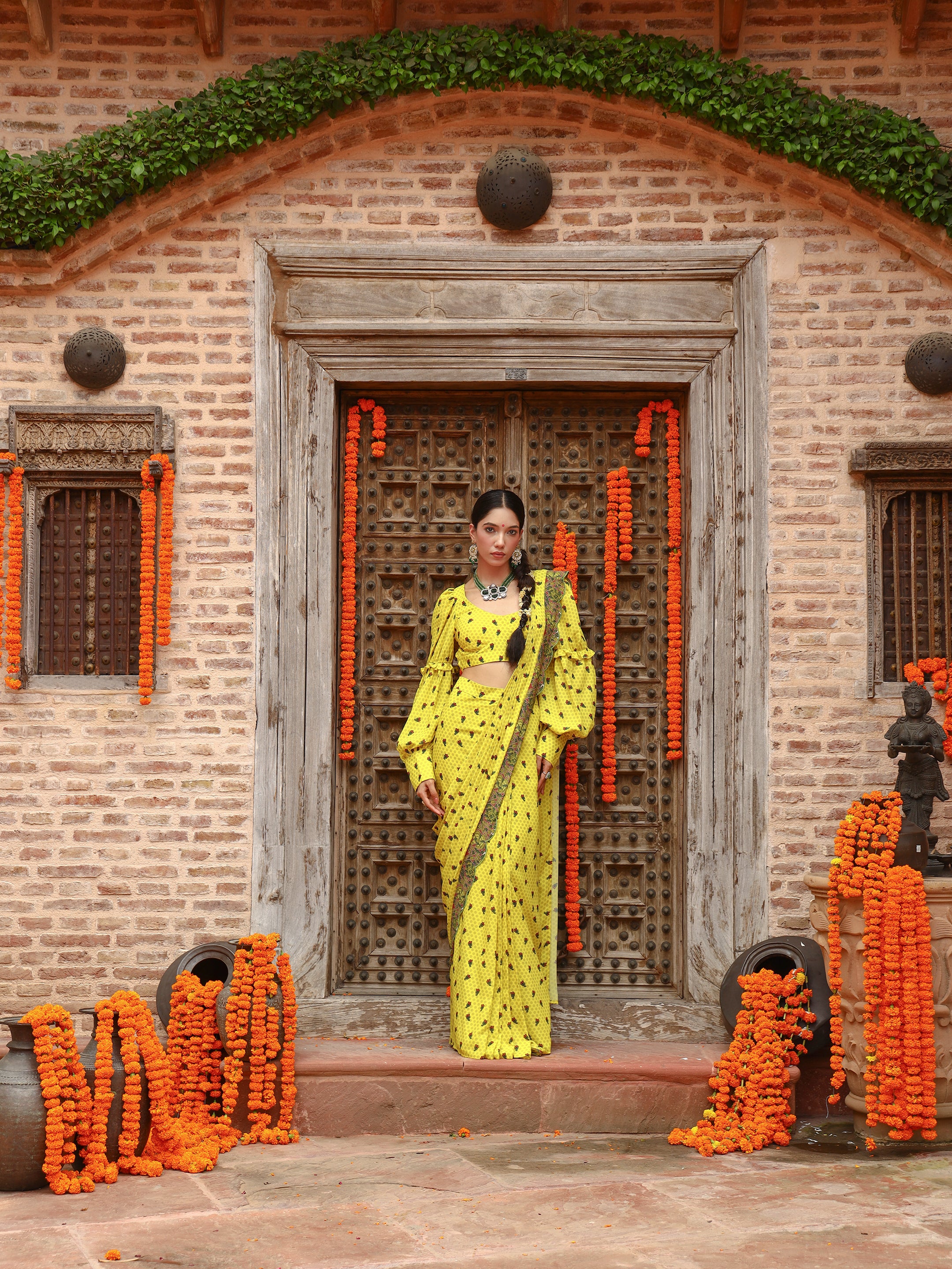 Presenting our lime yellow pre-draped saree, a striking ready-to-wear piece adorned with a scalloped design on the pallu. The accompanying choli features elegant bohemian sleeves, enhanced with ruffles that add a touch of sophistication. This ensemble captures a retro aesthetic, combining playful charm with timeless style, perfect for making a memorable impression at any occasion.