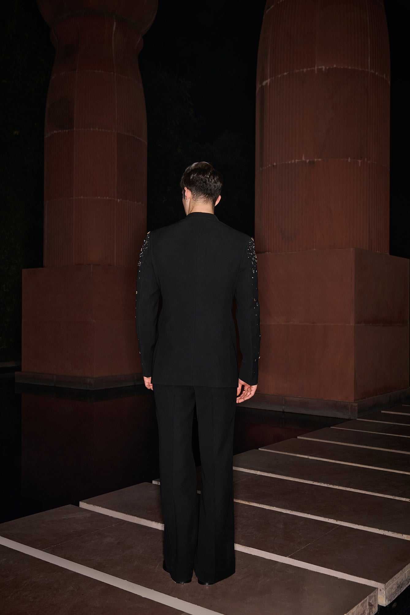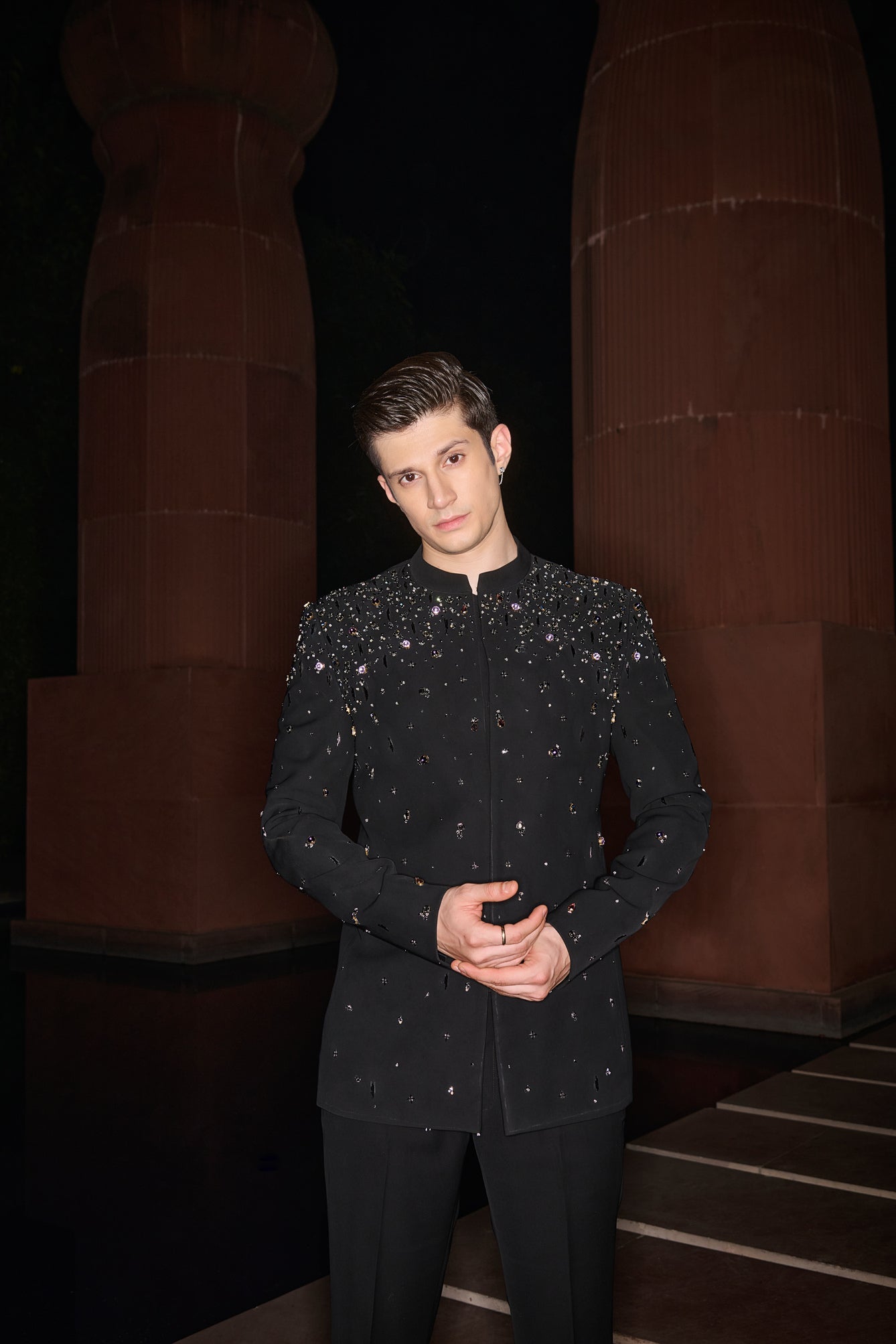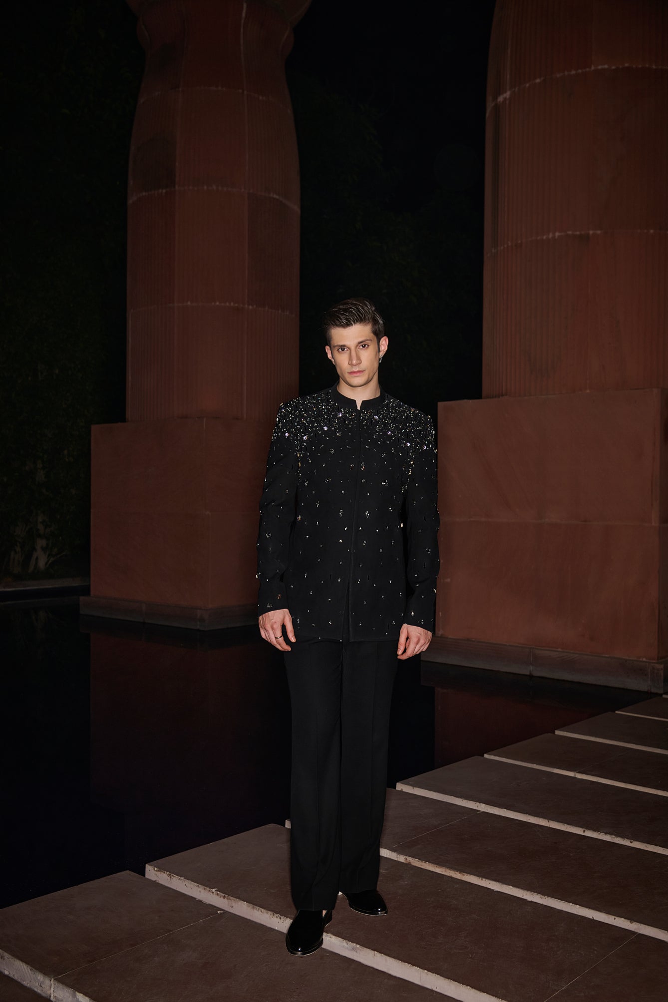 An all-black bandhgala beautifully adorned with vibrant colored stones and crystals, paired with matching pants
