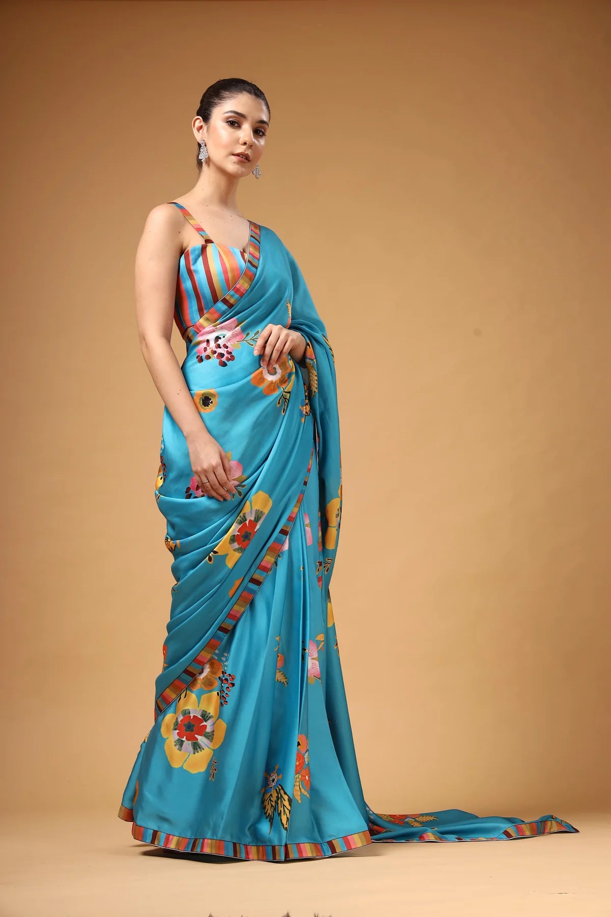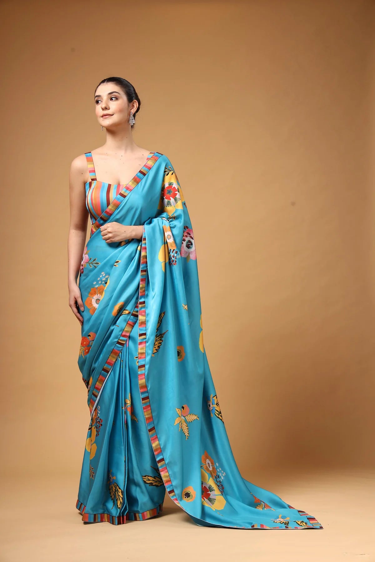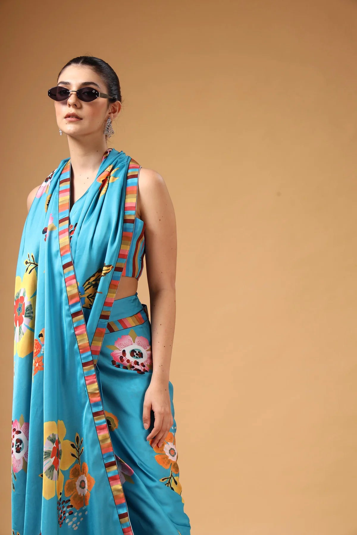 A pre-draped saree featuring a striped, multi-colour blouse paired with an all-over floral printed saree - a perfect fusion of modern ease and timeless tradition. The unexpected mix of patterns adds a playful edge, making it a statement piece for those who love to blend heritage with contemporary flair.