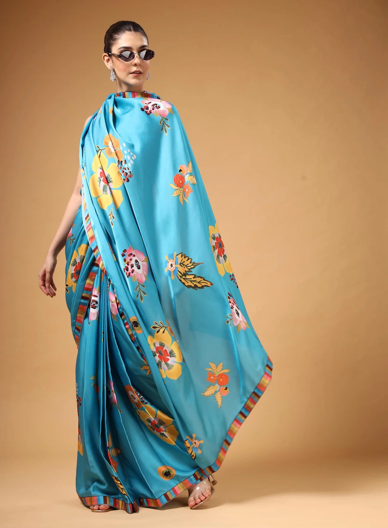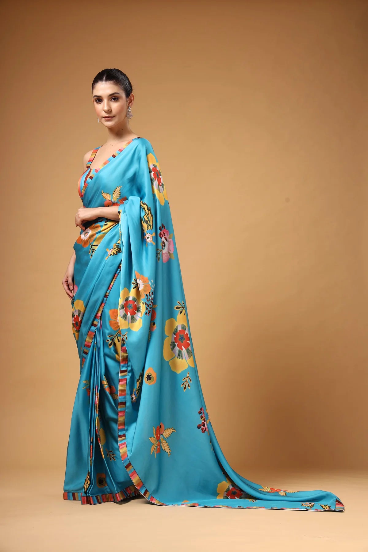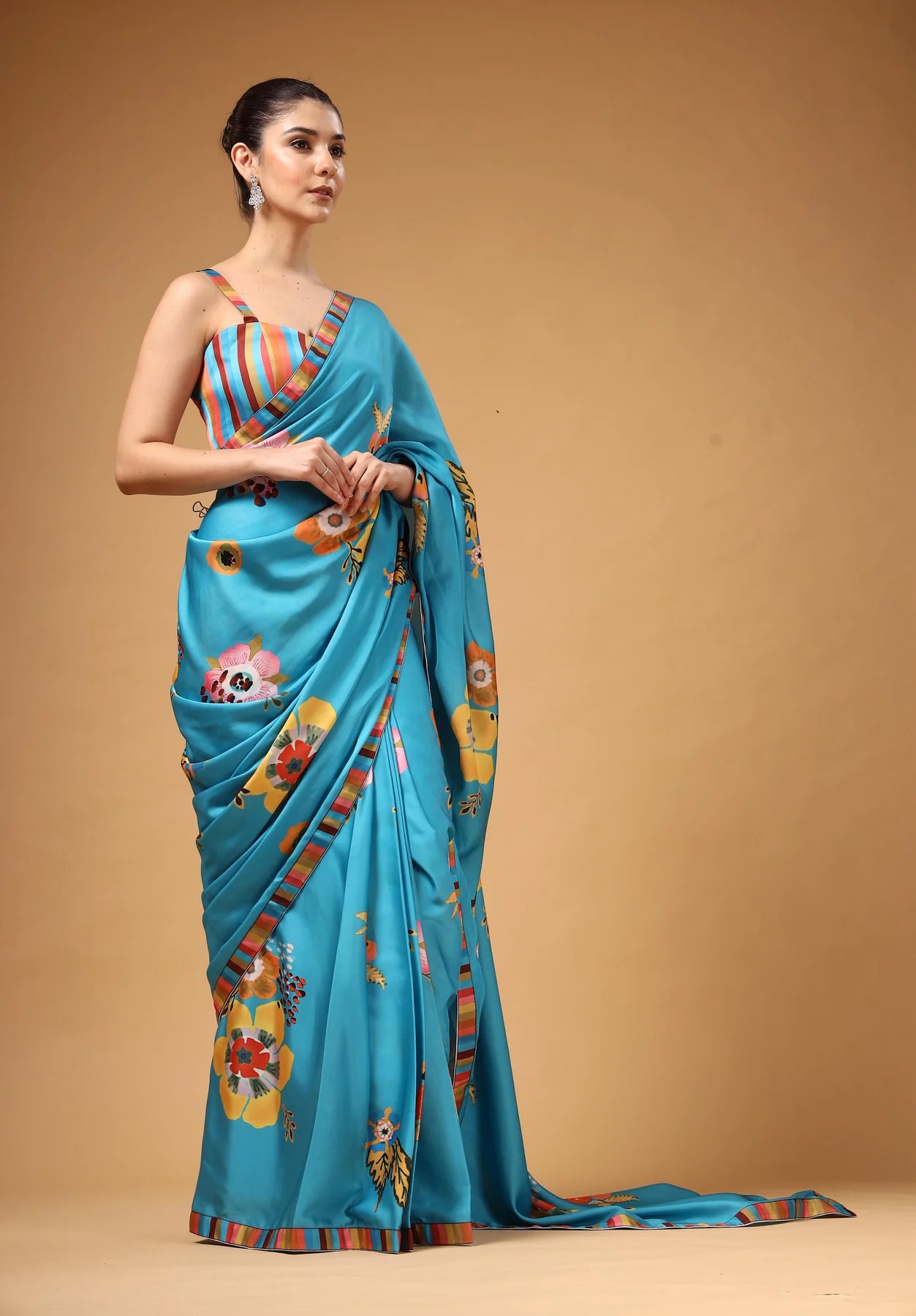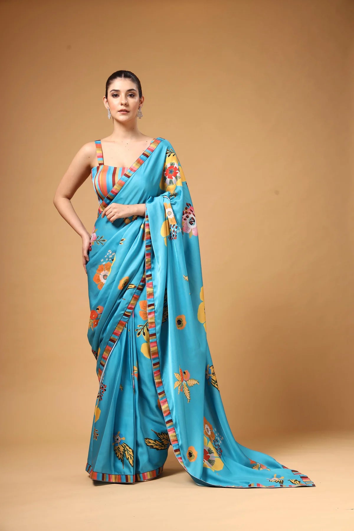 A pre-draped saree featuring a striped, multi-colour blouse paired with an all-over floral printed saree - a perfect fusion of modern ease and timeless tradition. The unexpected mix of patterns adds a playful edge, making it a statement piece for those who love to blend heritage with contemporary flair.