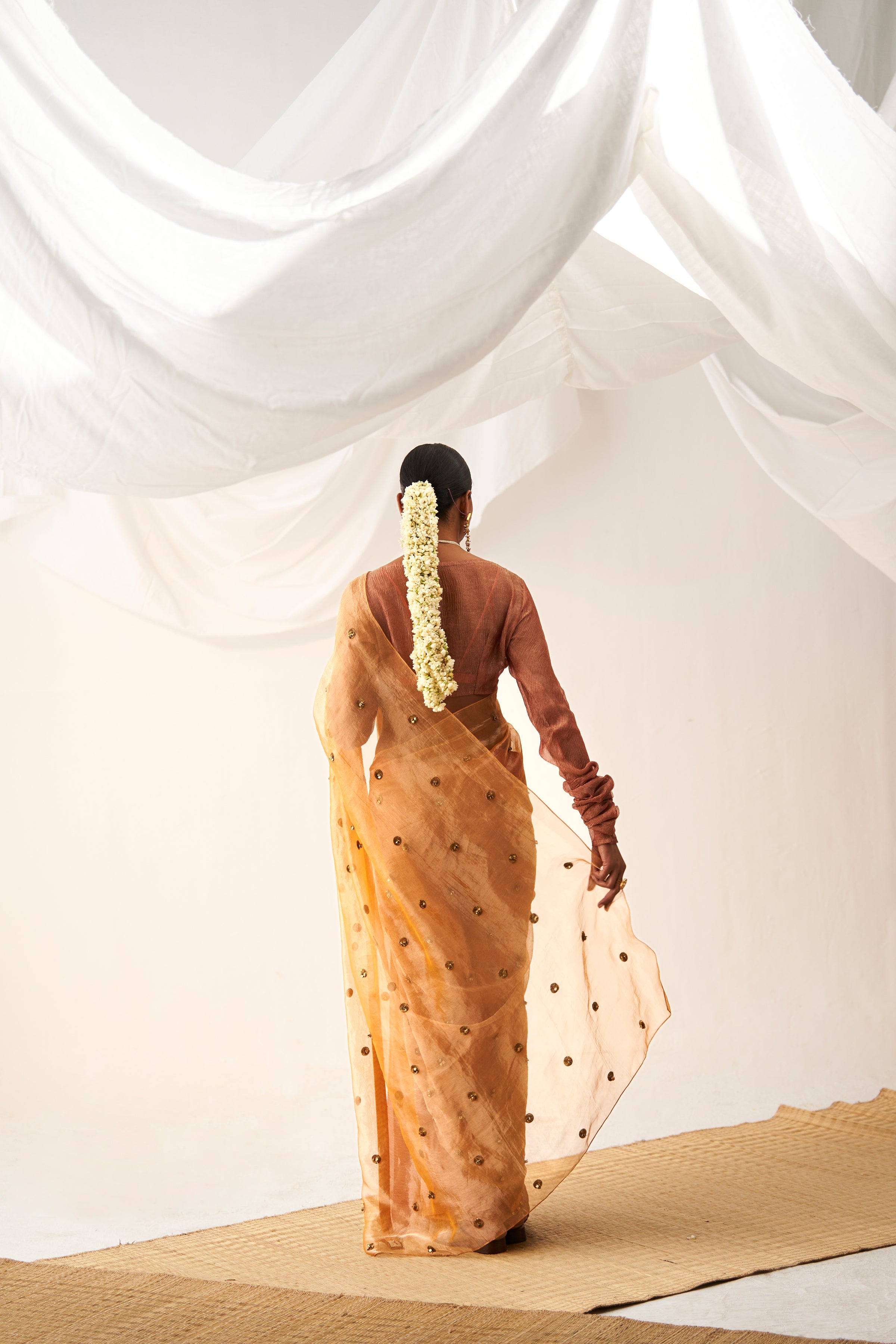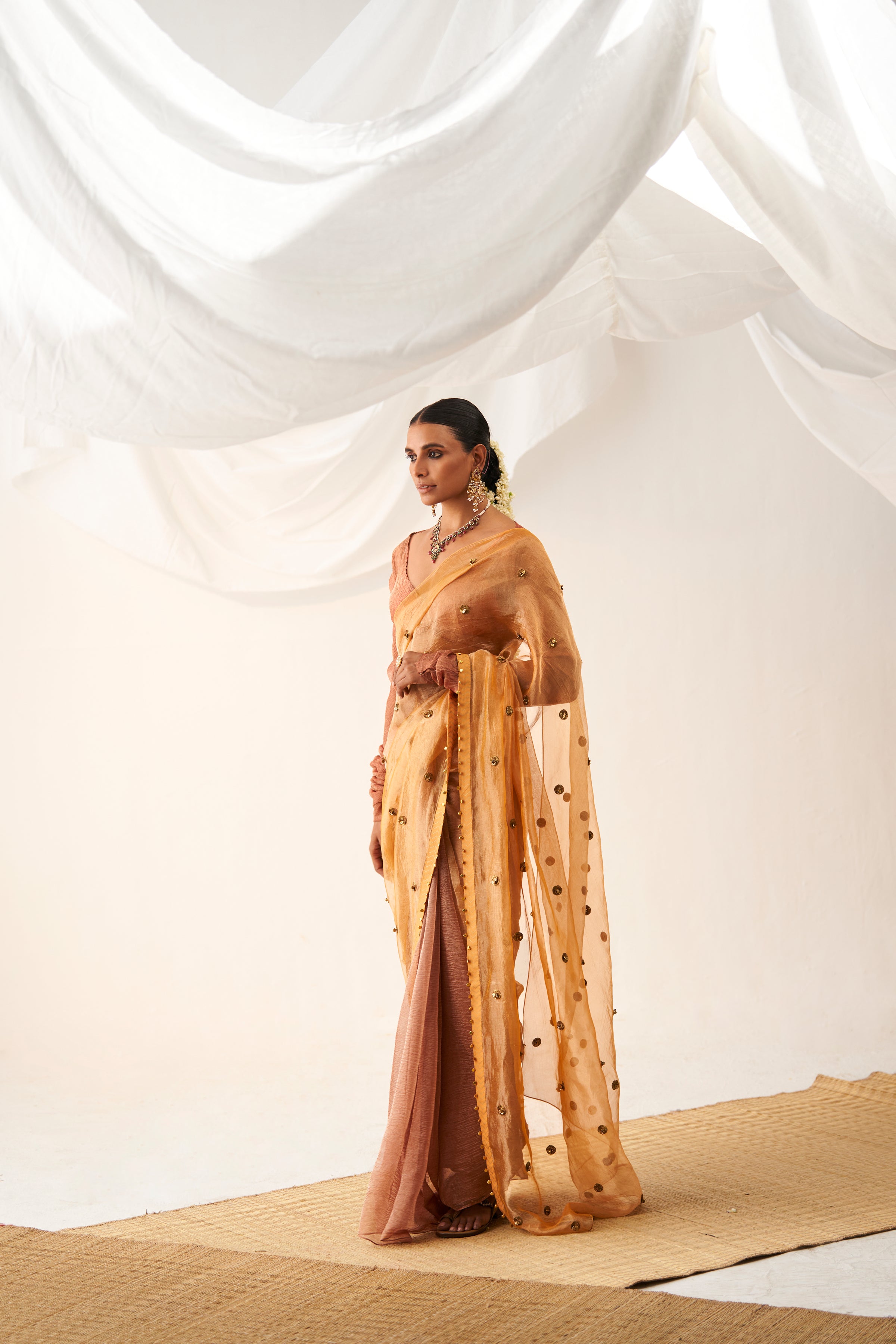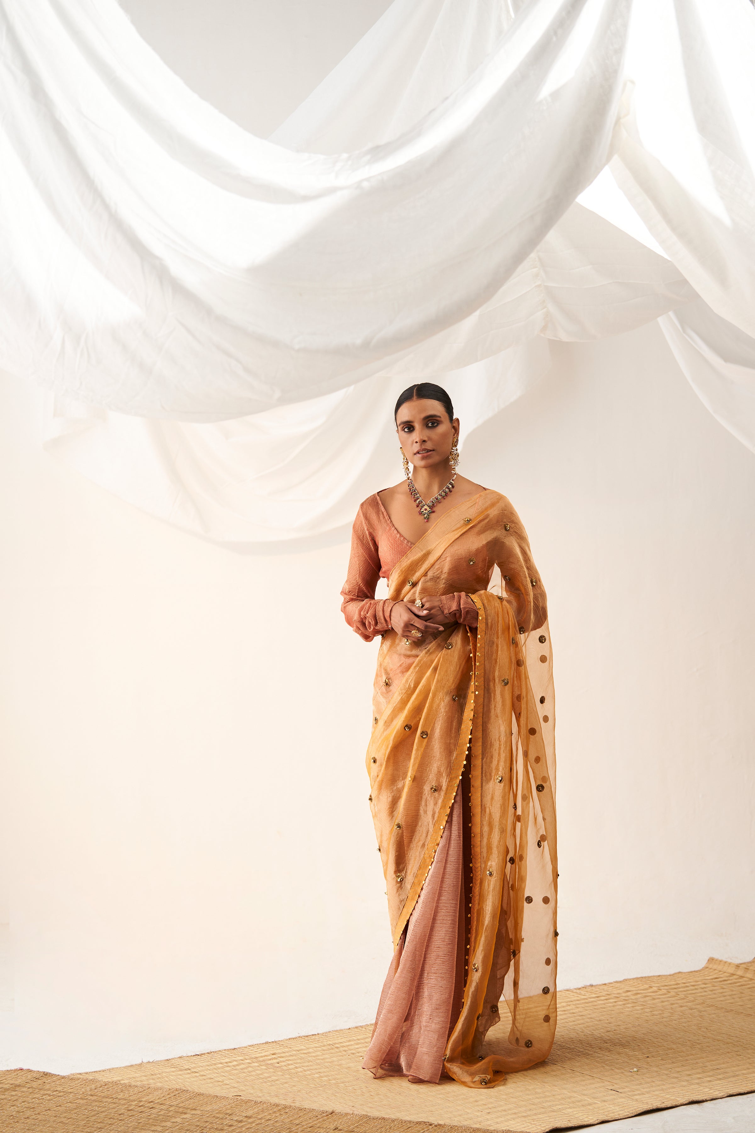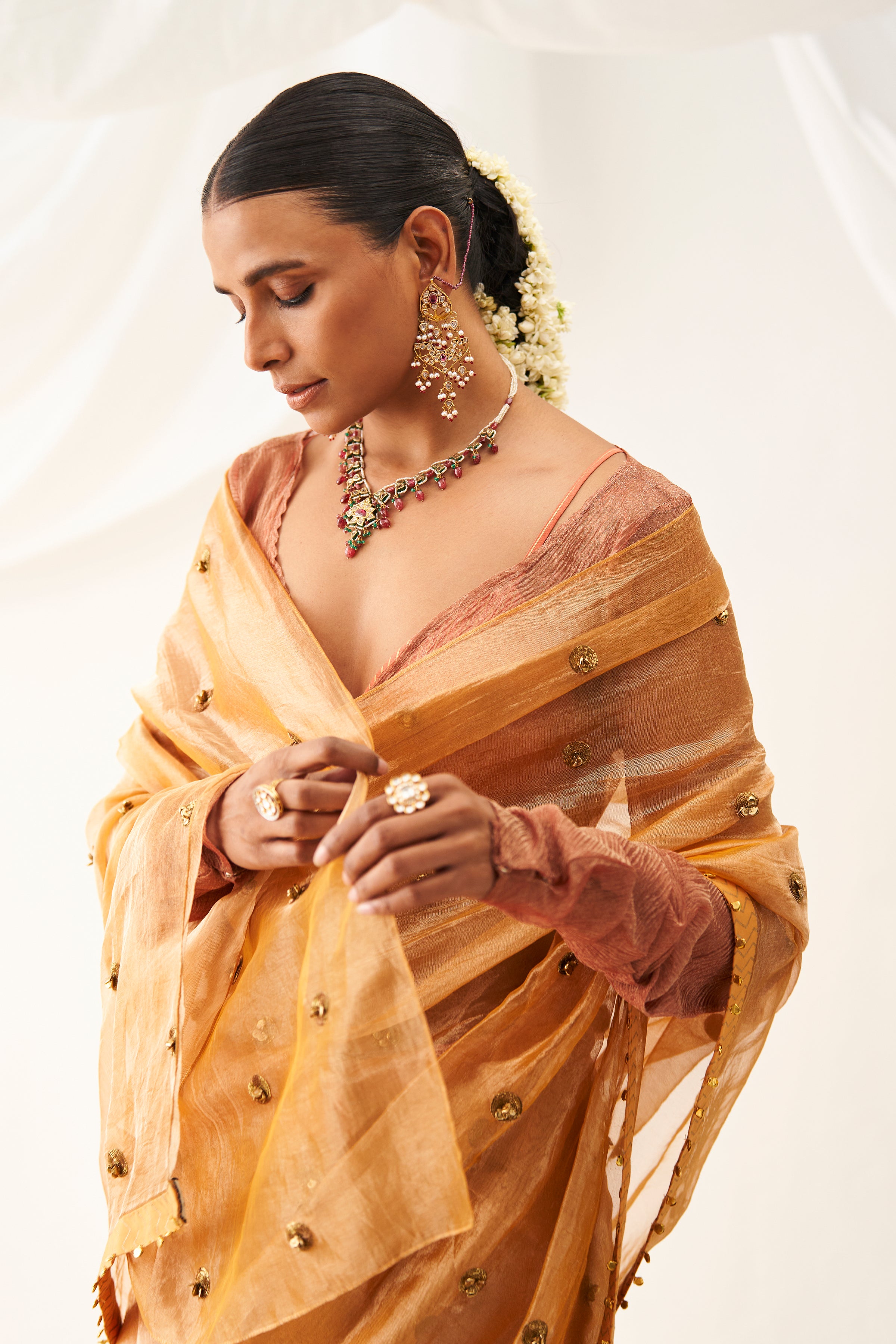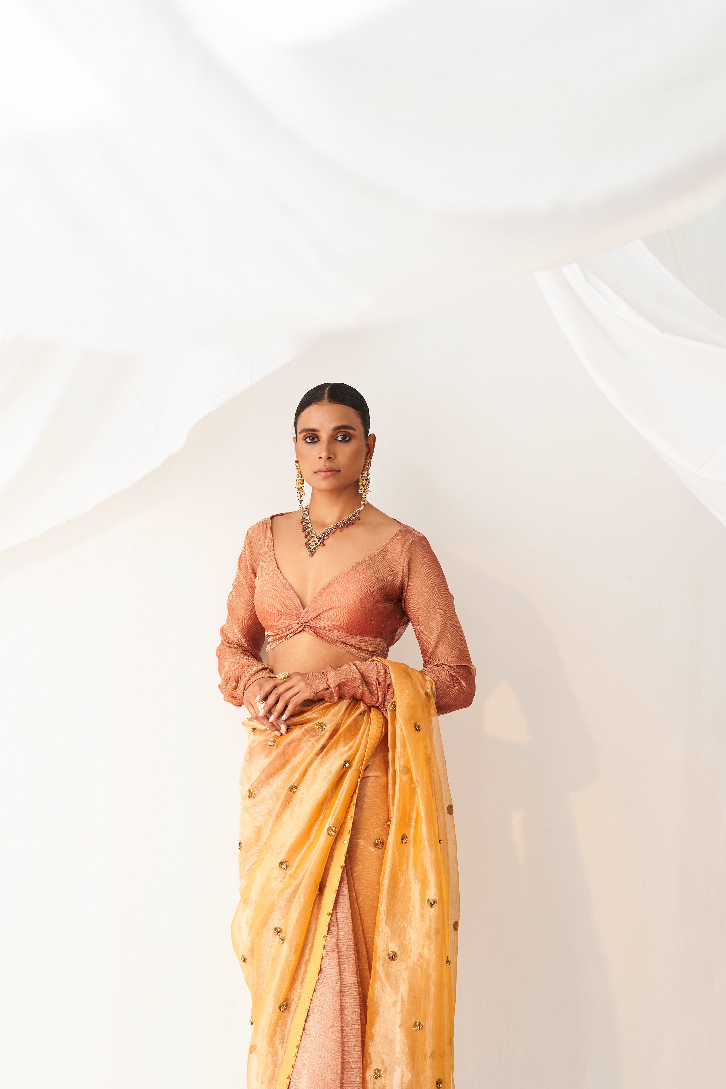 Churi sleeves knot top paired with regular saree which has peach silk tissue palla with intricated ghunghroo work.