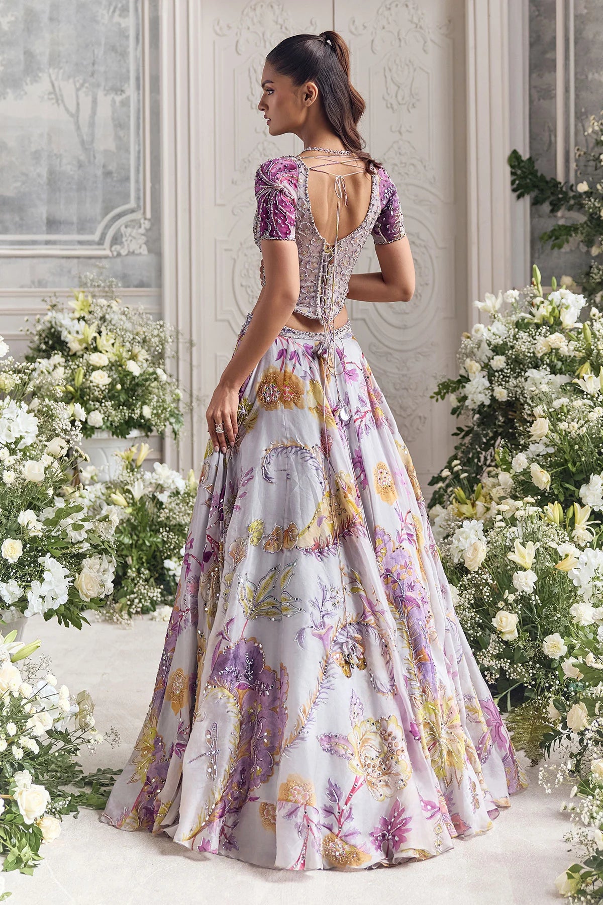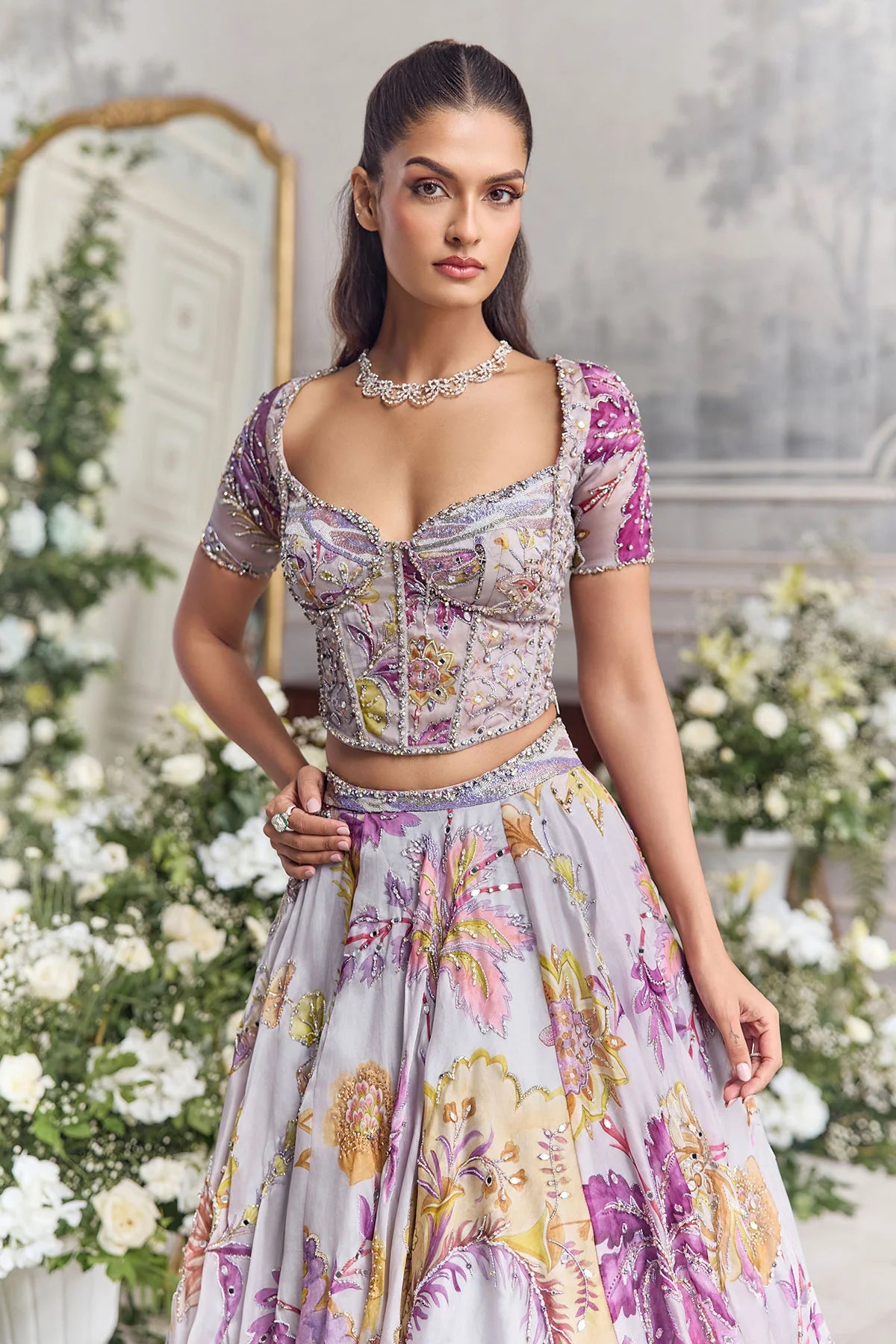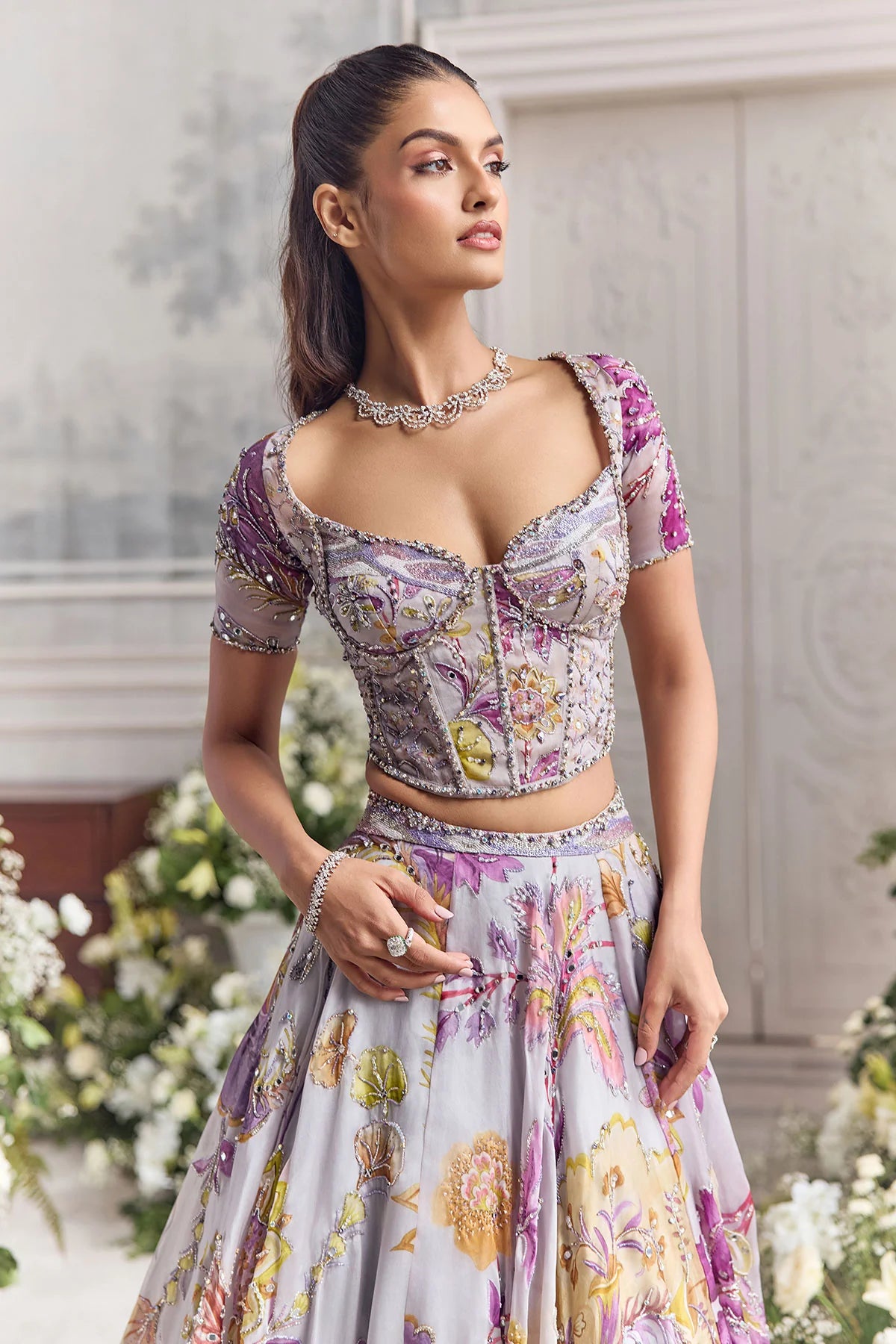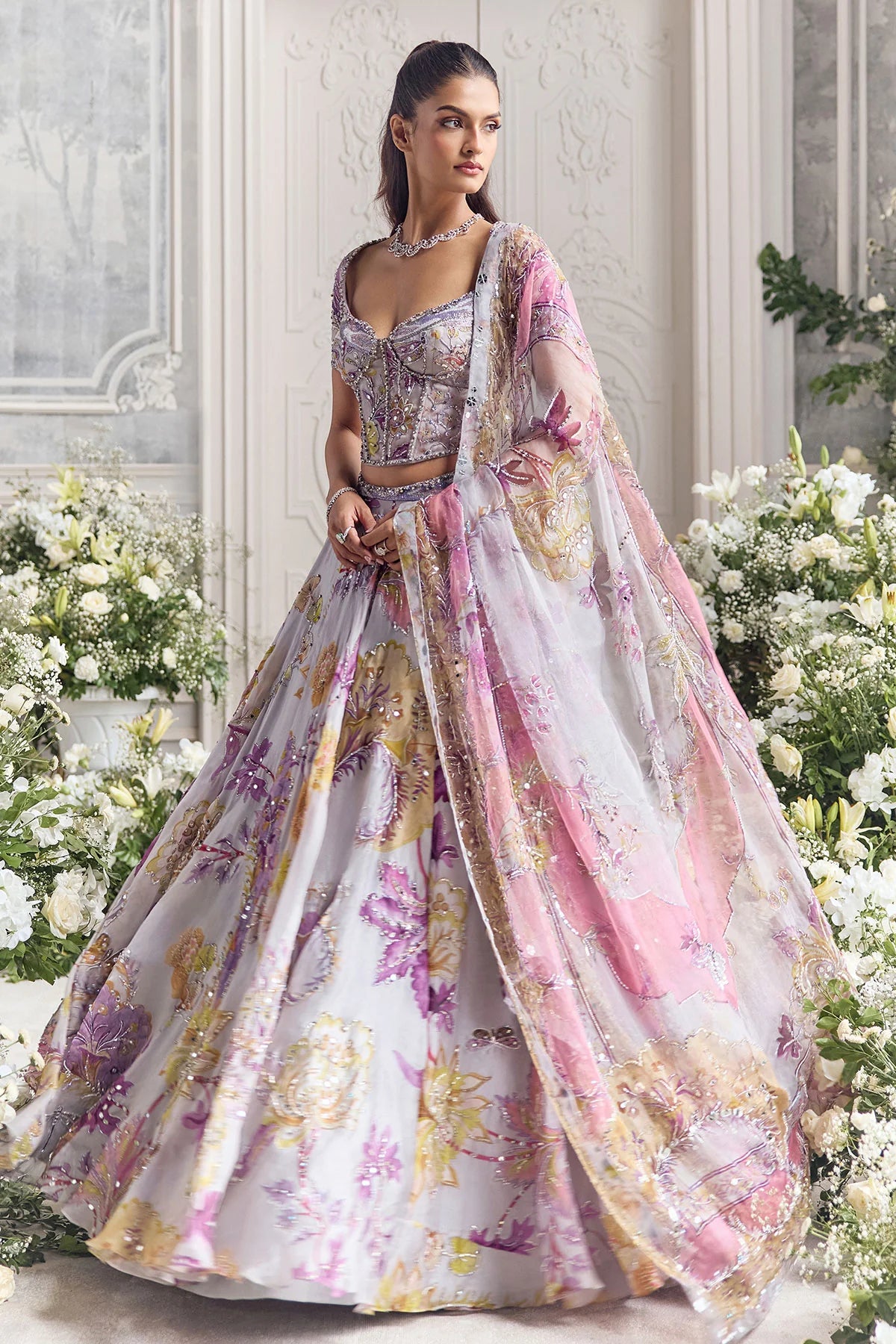 SLEEVED CORSET BLOUSE PAIRED WITH EMBROIDERED DUPATTA AND LEHENGA