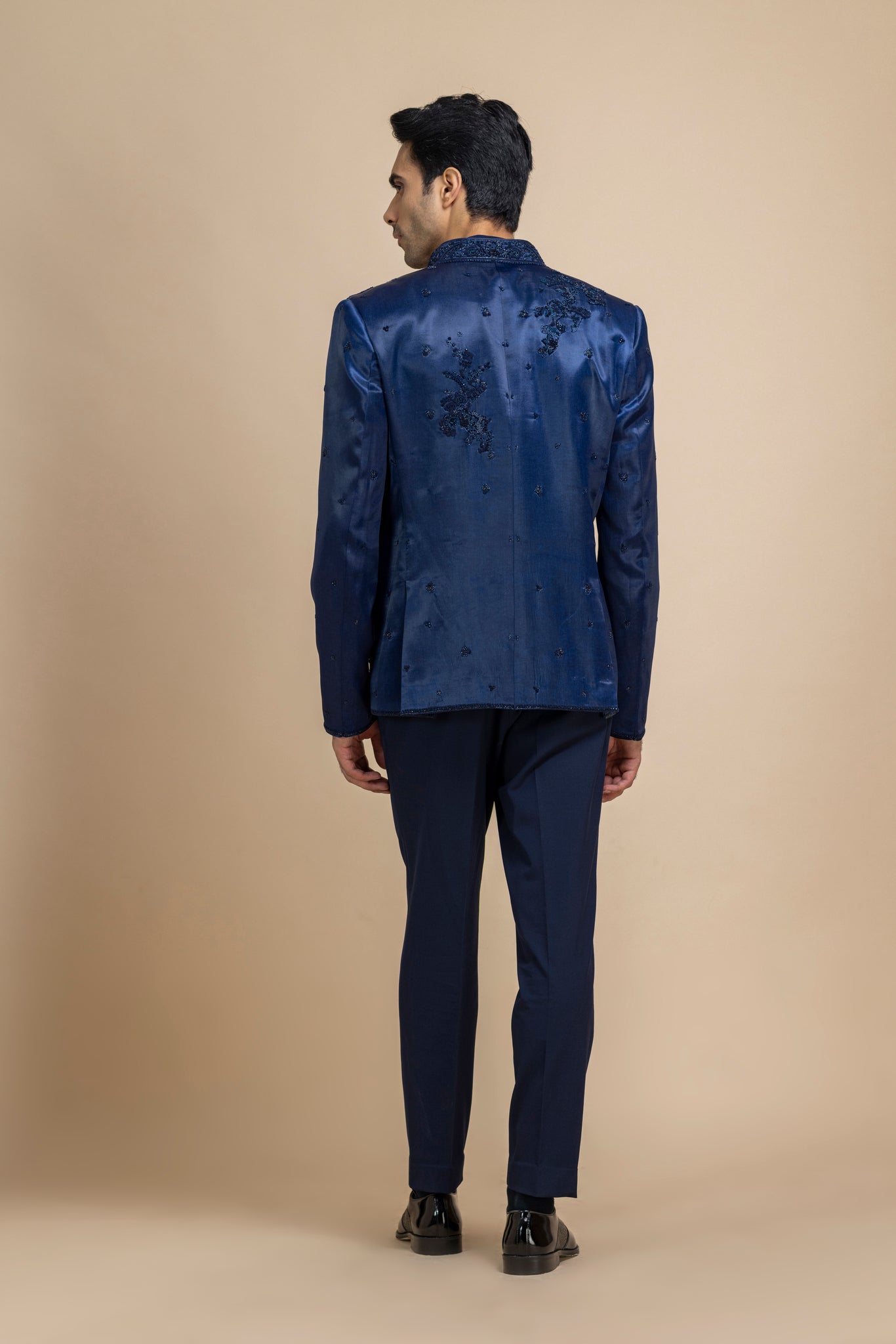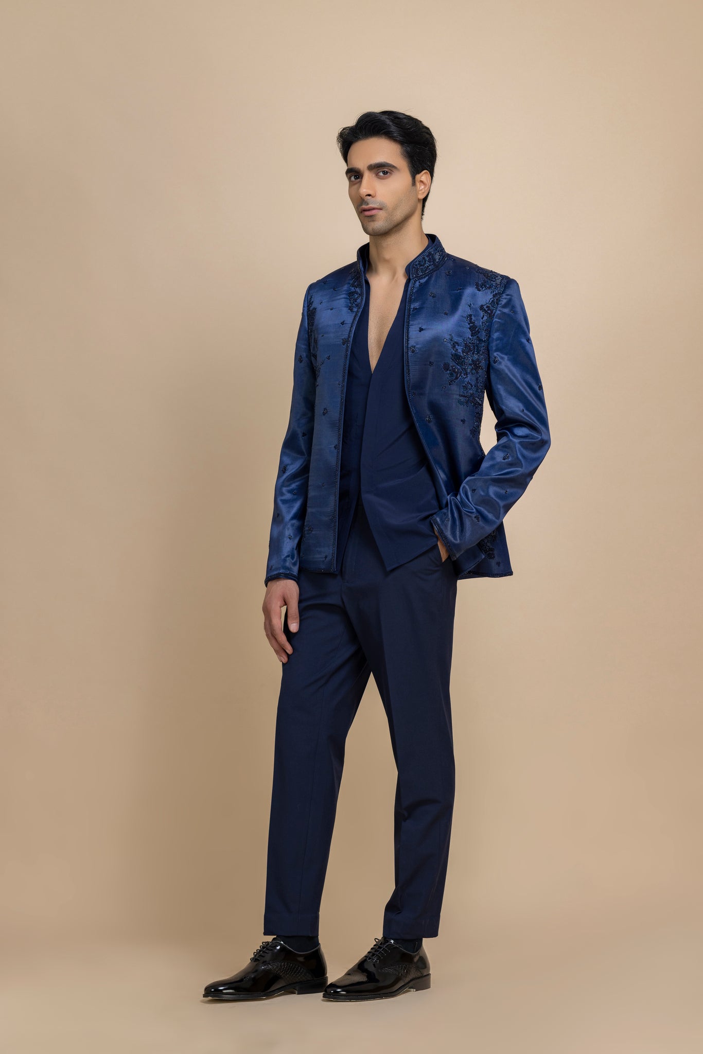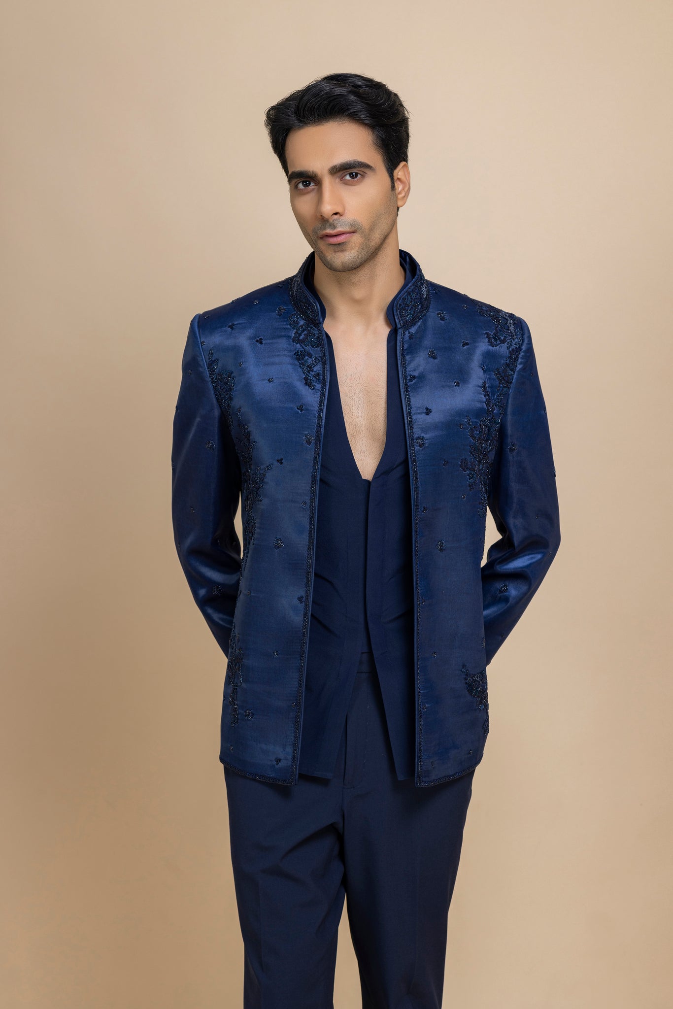 "This Midnight Blue Imported Satin Jacket Is Meticulously Hand-Embroidered With Intricate Motifs, Paired With A Sleek Crepe Shirt And Japanese Crepe Trousers. The Ensemble Exudes Refined Craftsmanship And Modern Elegance — Perfect For Weddings, Festive Soirées, Or Evening Celebrations."