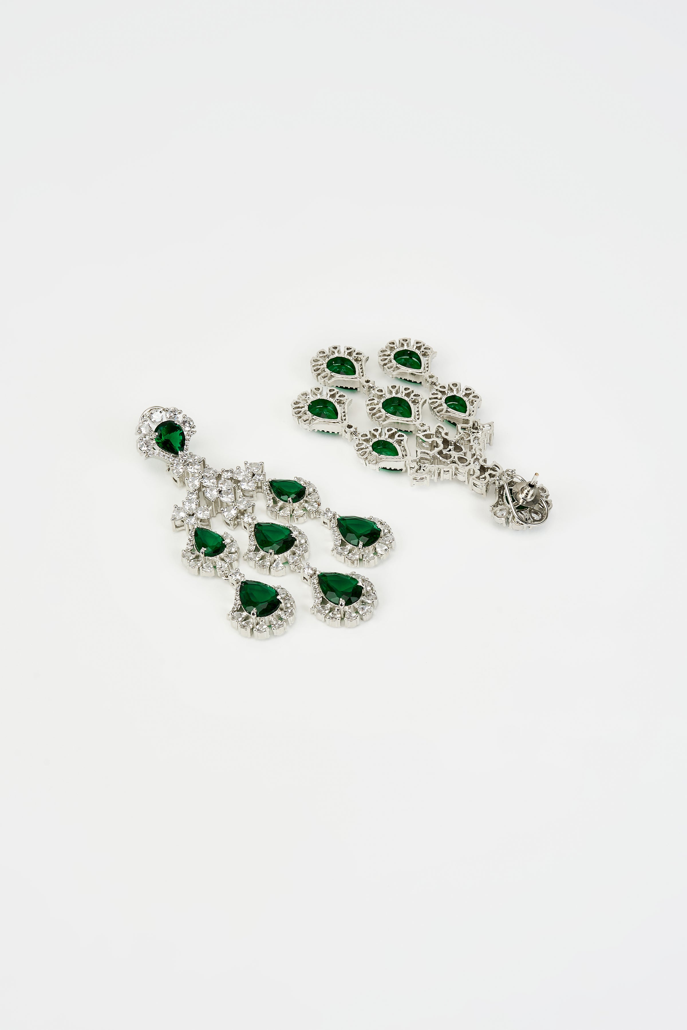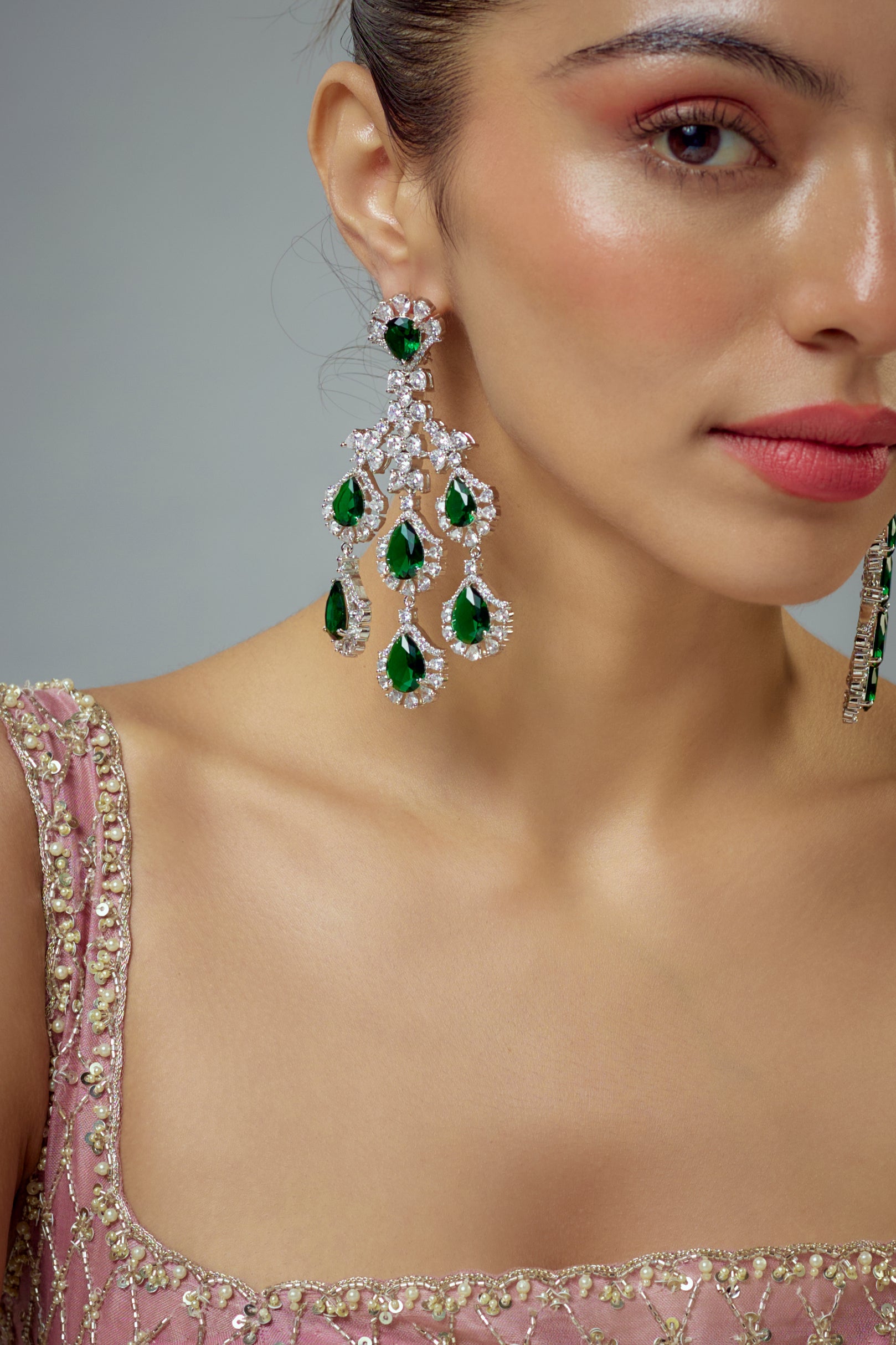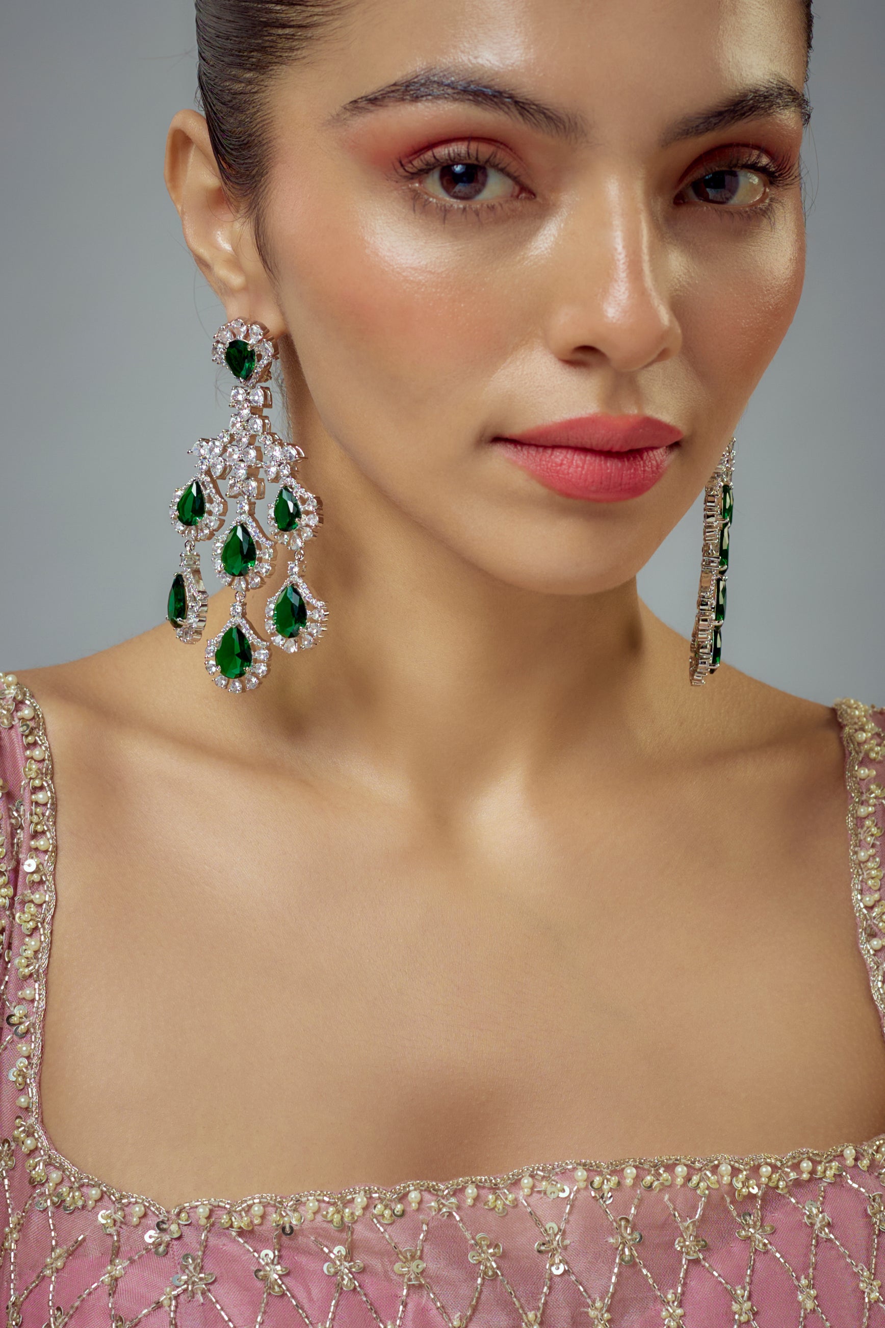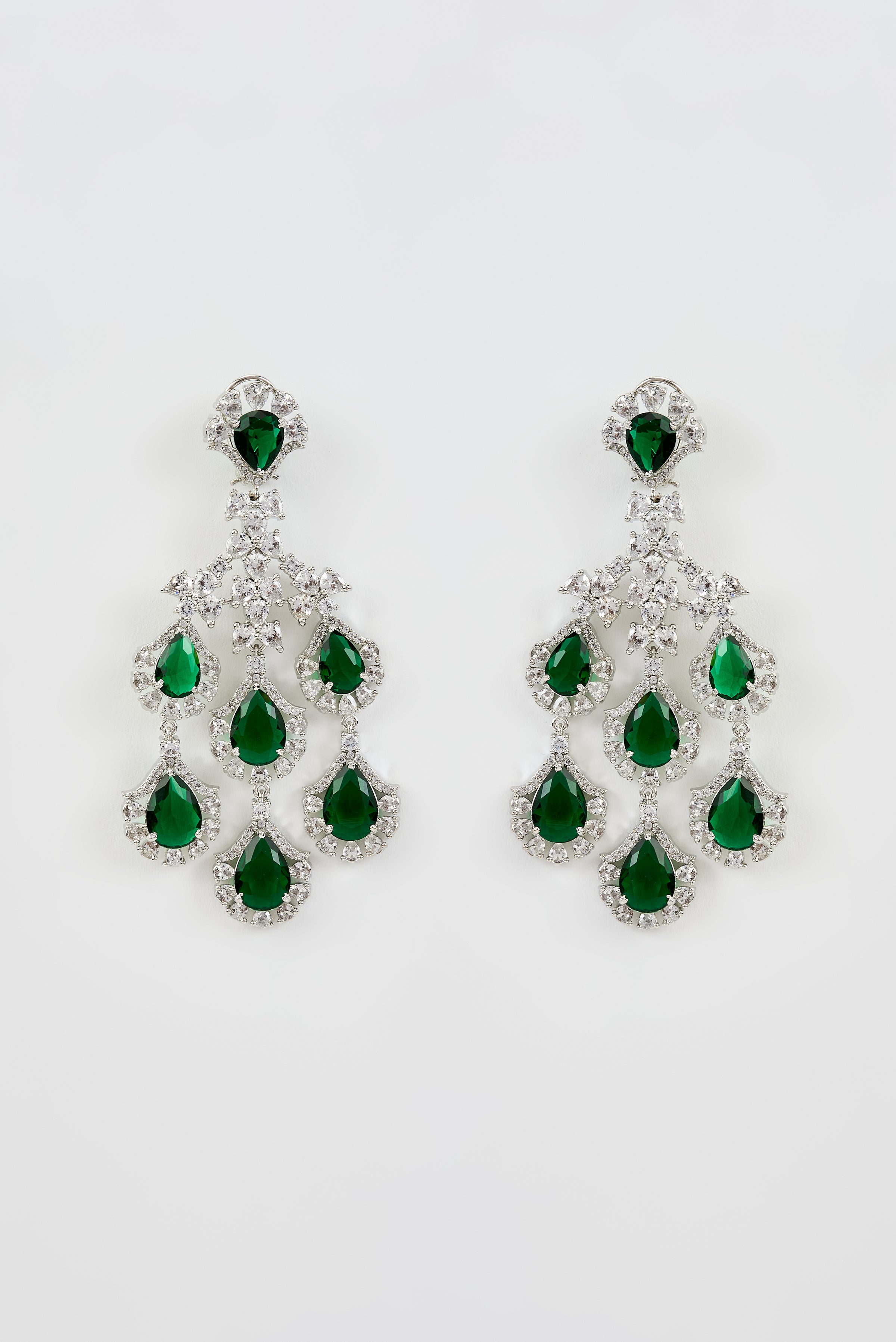 Elegant drop earrings featuring vibrant green gemstone, adorned with sparkling crystal. Perfect for wedding & festive occasion, these lightweight yet luxurious earrings add timeless charm to any outfit.