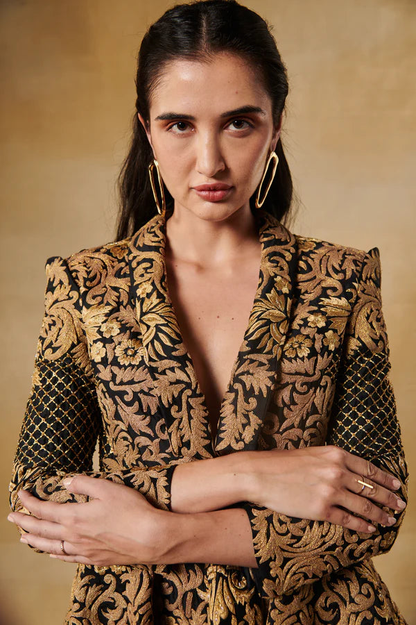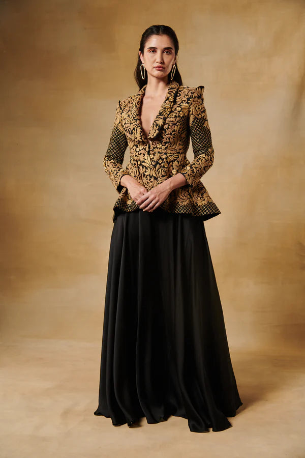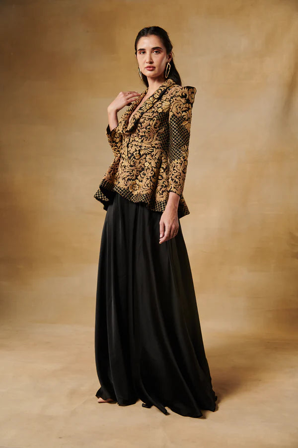 Midnight black peplum antique gold jacket with flared georgette sharara pants.