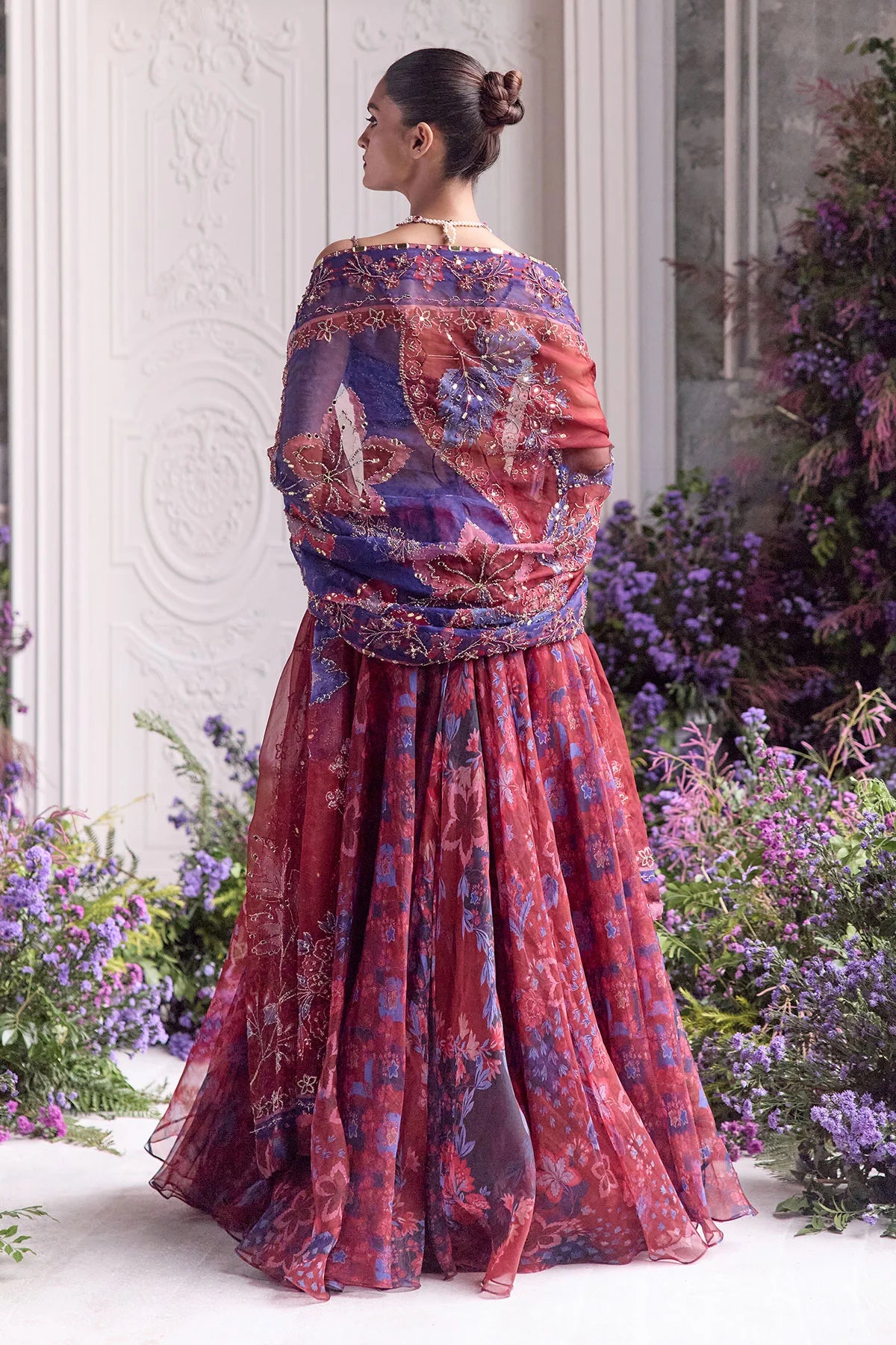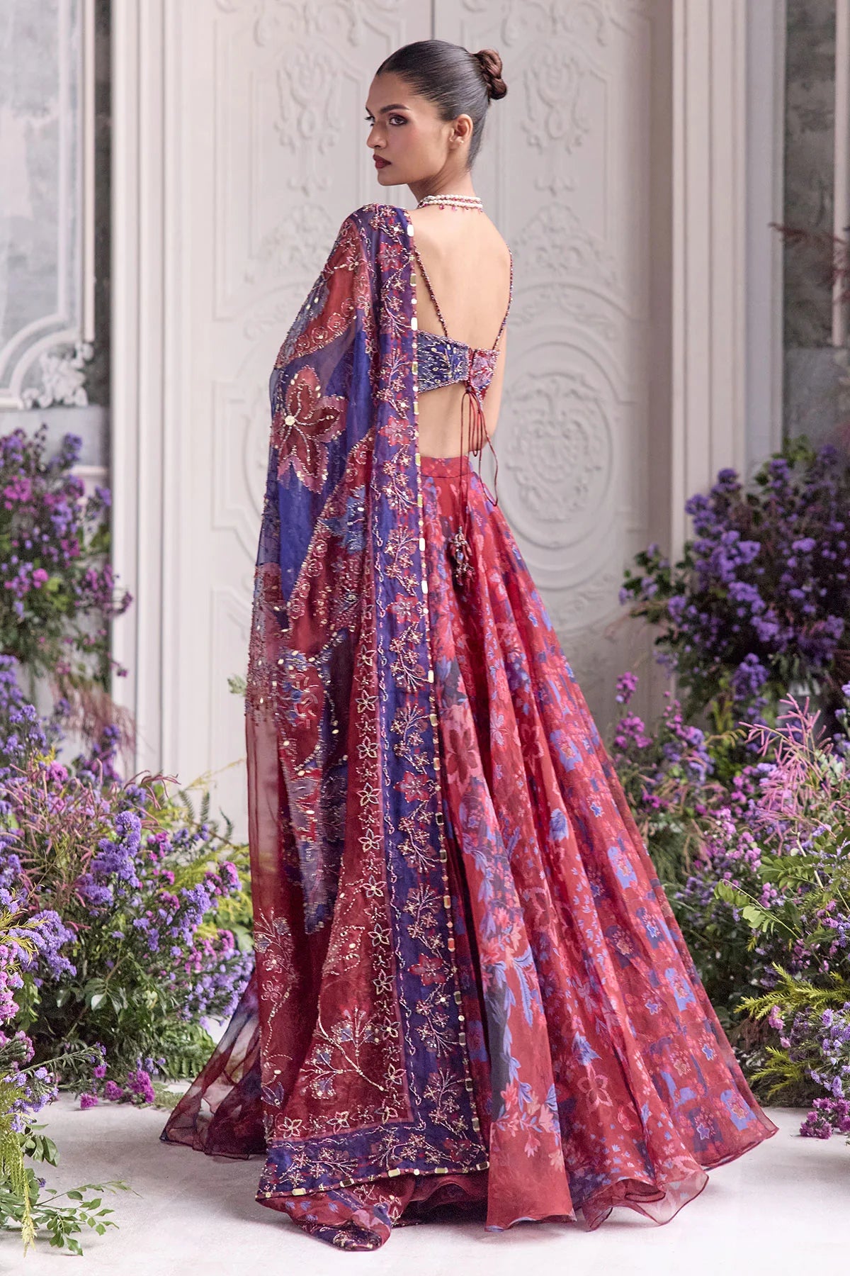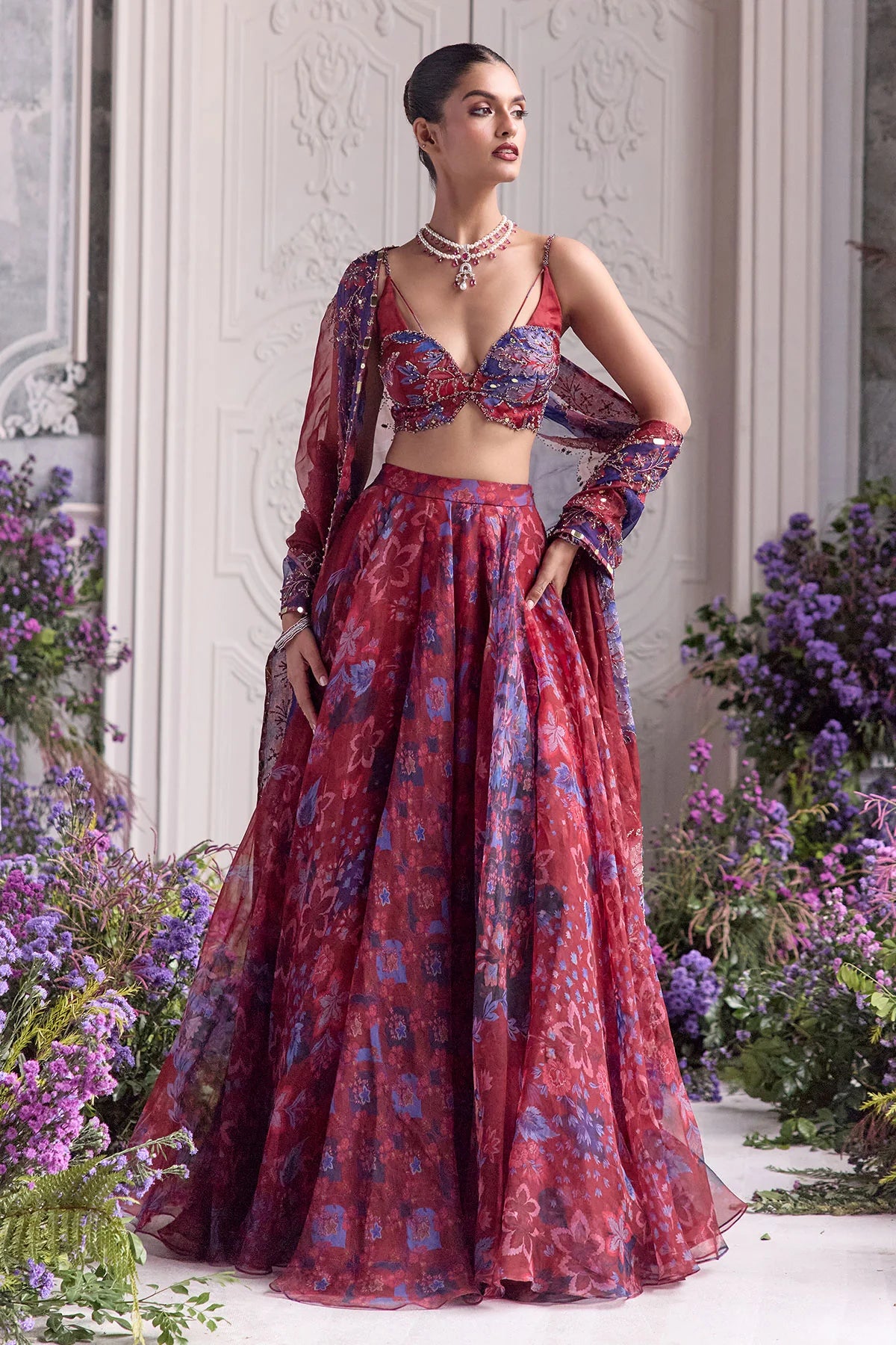 RED EMBROIDERED BRALETTE PAIRED WITH EMBROIDERED DUPATTA AND FLORAL LEHENGA